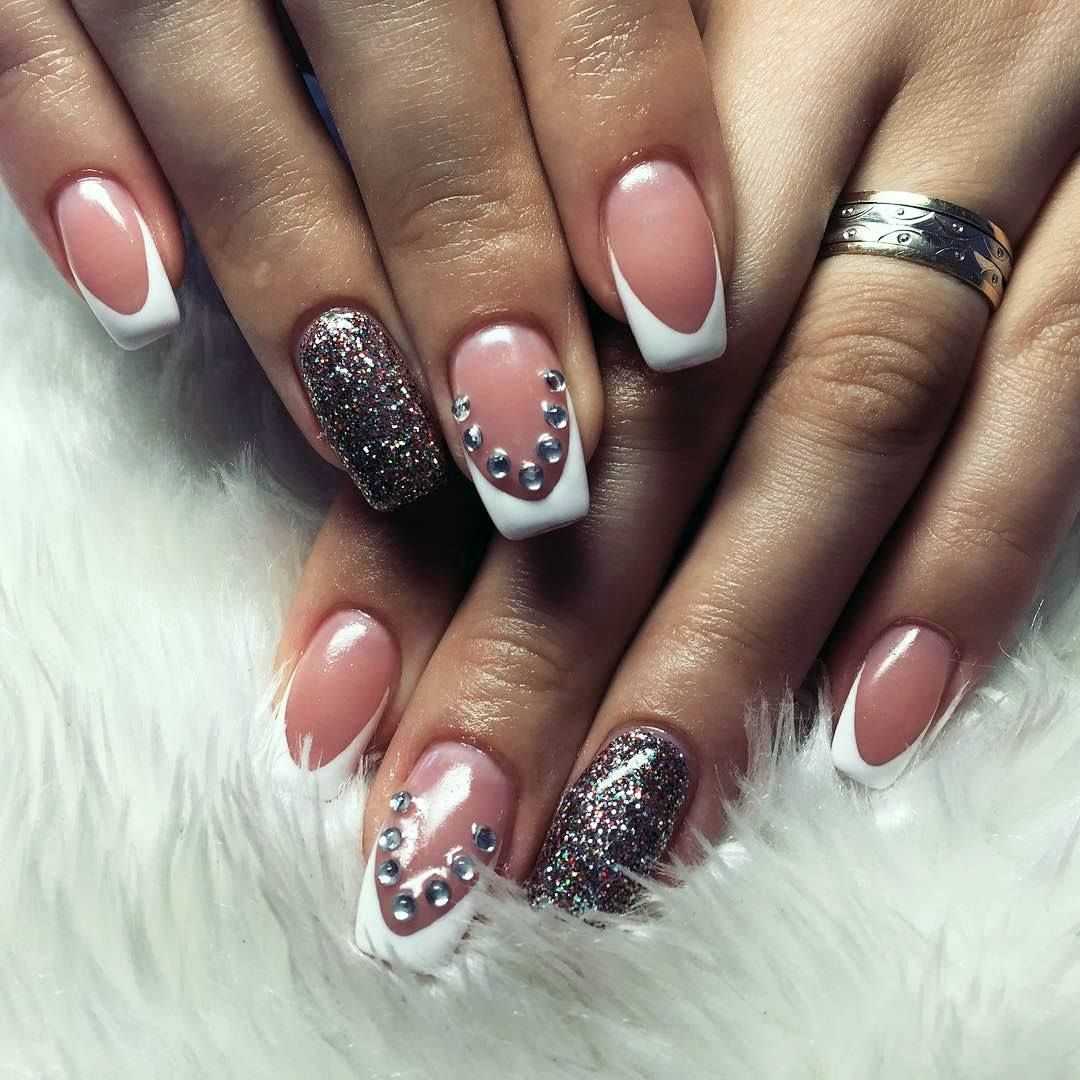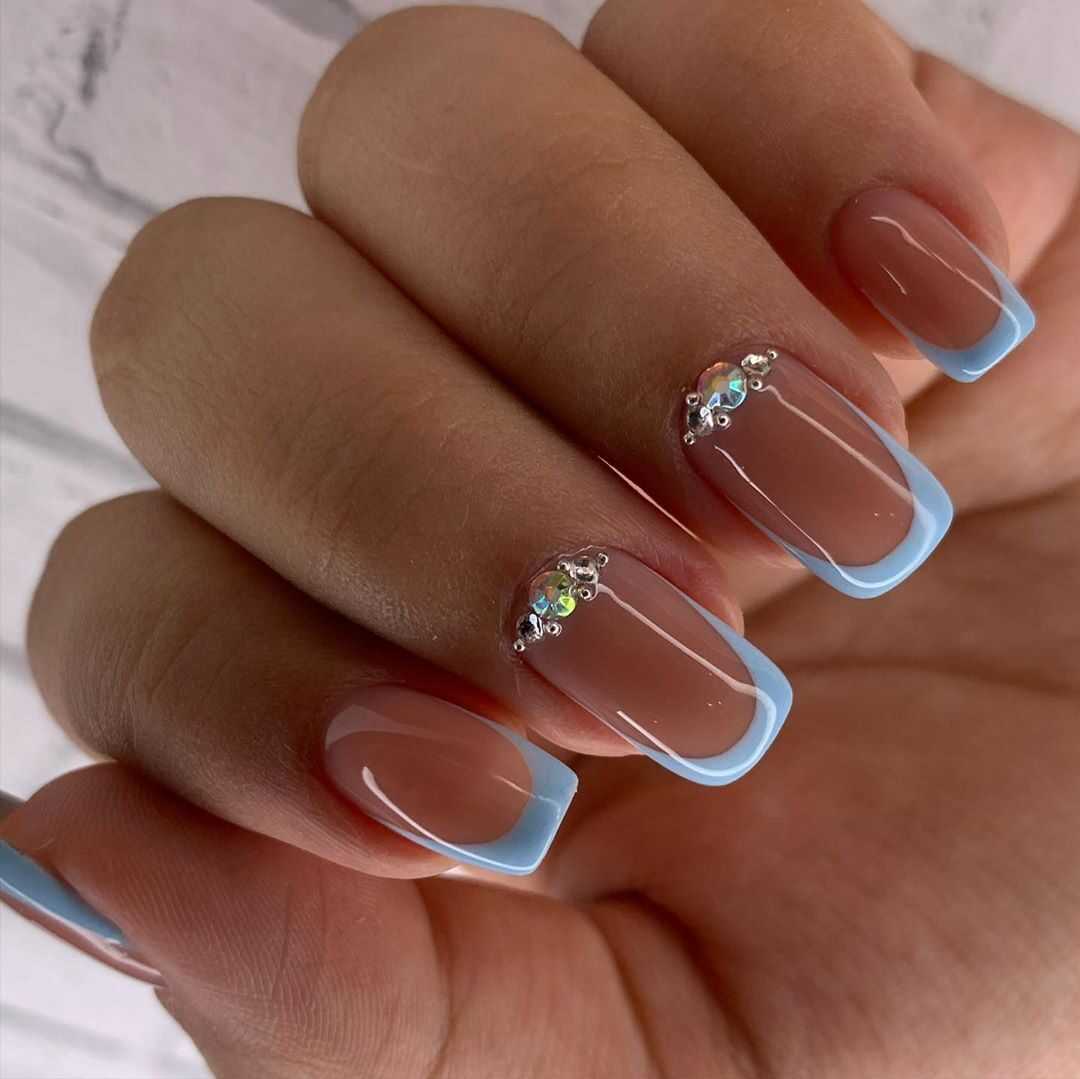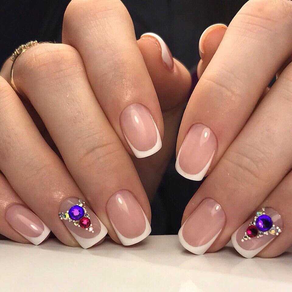 Френч остается востребованным во все времена. Для квадратного маникюра он также актуален. Более того, полоски френча будут стильно выглядеть, если их украсить геометрическими стразами или камифубуками.
