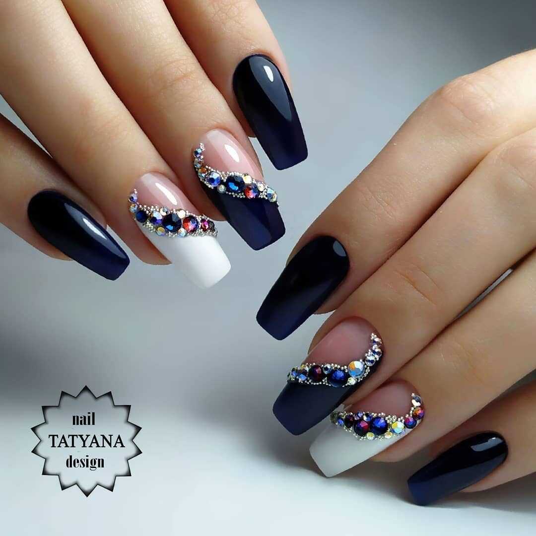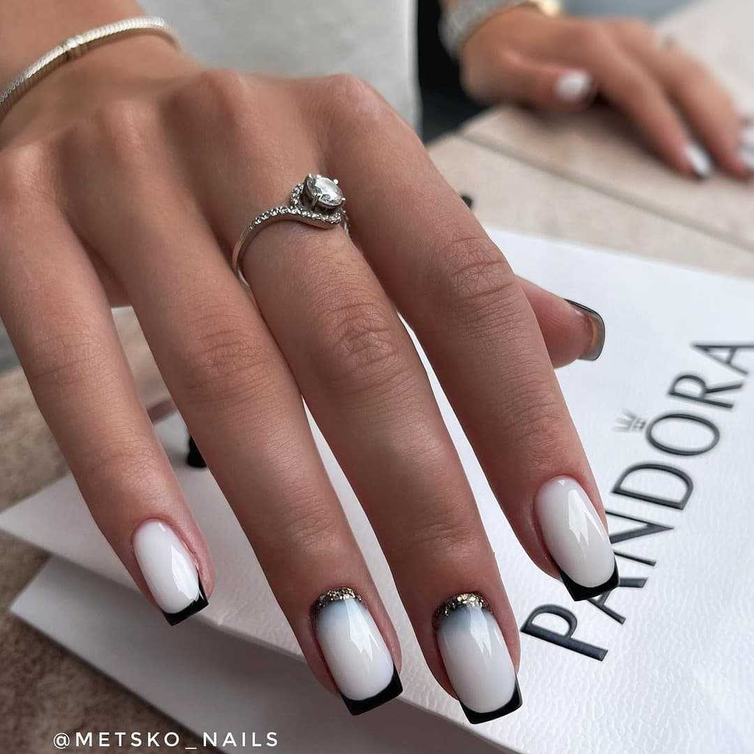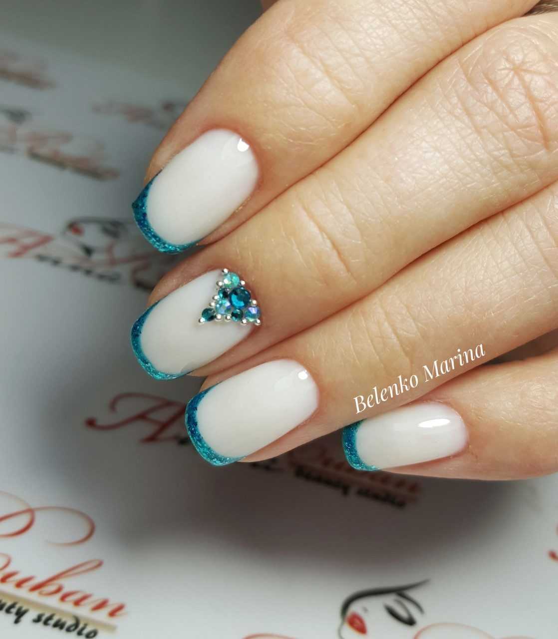 Френч остается востребованным во все времена. Для квадратного маникюра он также актуален. Более того, полоски френча будут стильно выглядеть, если их украсить геометрическими стразами или камифубуками.