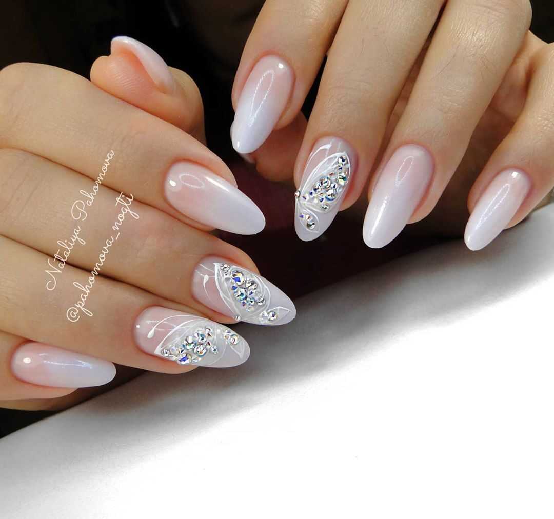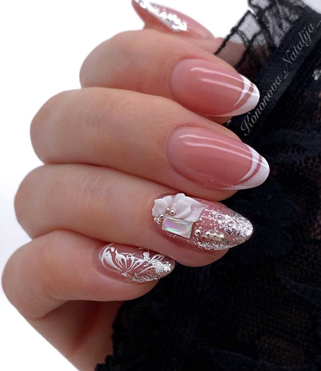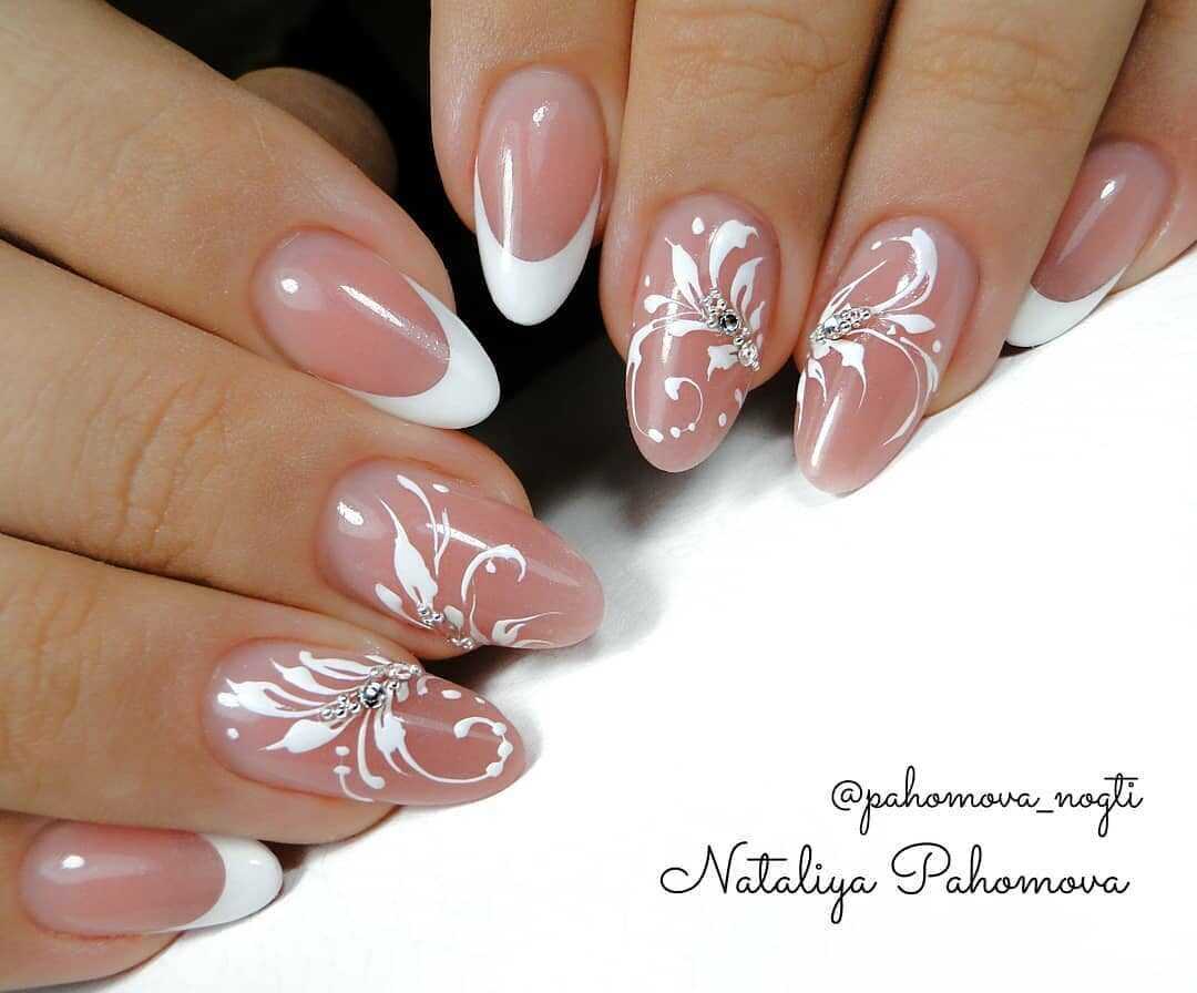 Свадебный маникюр требует красивых цветочных и нежных рисунков. Крупные и яркие рисунки здесь будут излишними.