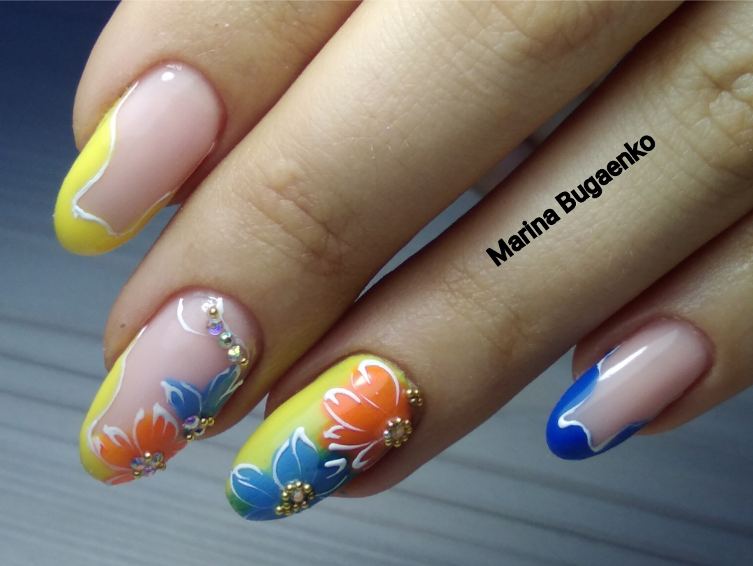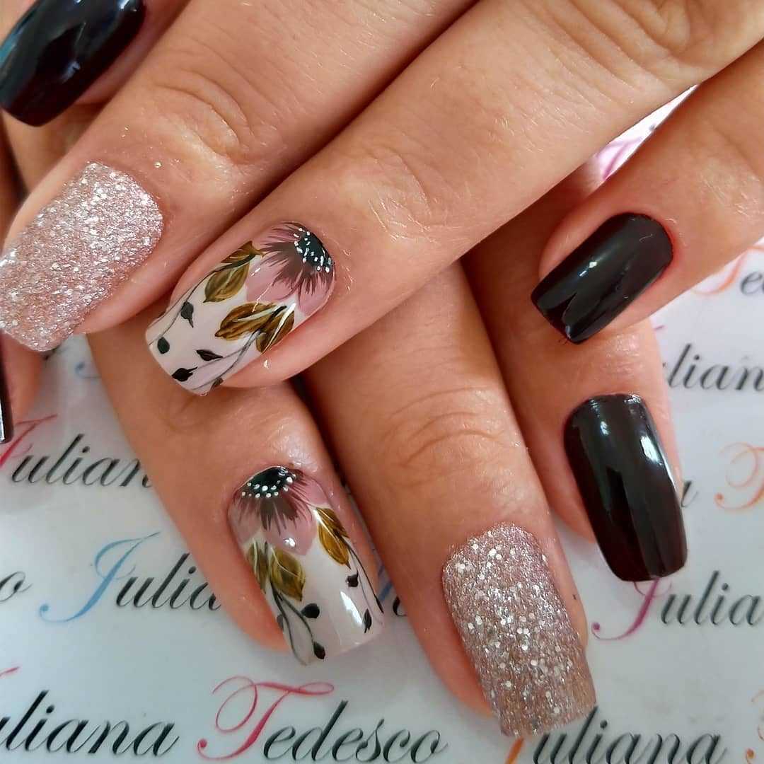 Цветочные мотивы создают изысканный, романтичный образ. Но поскольку этот дизайн довольно яркий, то его лучше использовать для одного-двух пальцев.