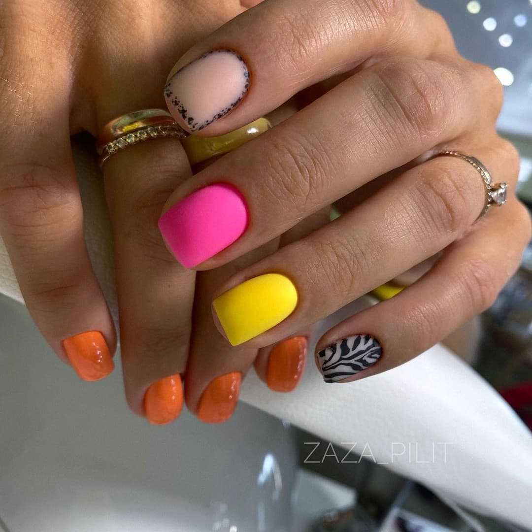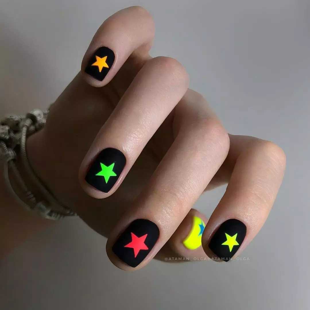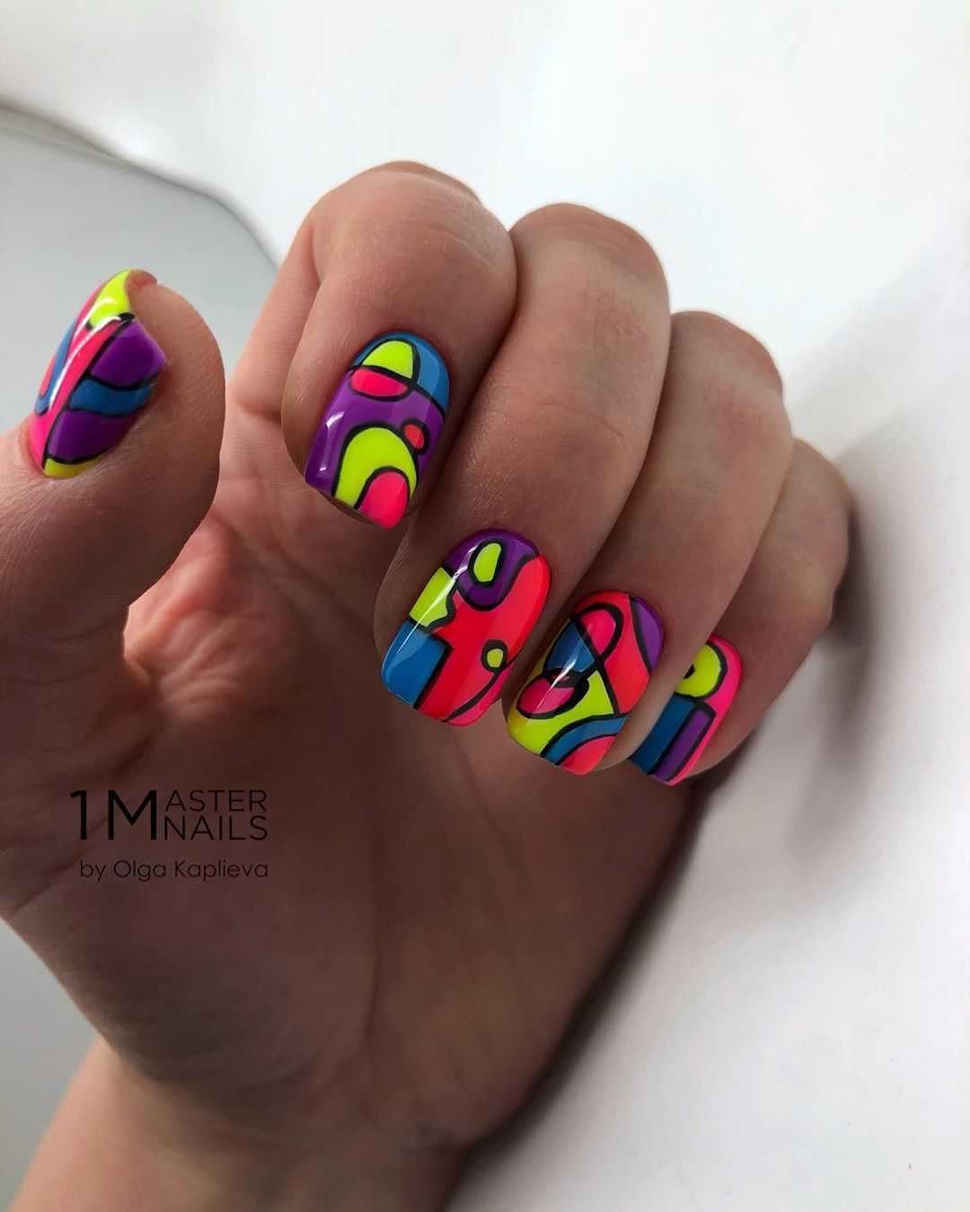 На коротких ногтях возможны все описанные выше декоративные приемы, но в этом случае стоит сделать акцент на совмещении разного декора на разных пальцах. Яркий неон в этом случае очень хорош, возможен и сдержанный френч. Однако мы рекомендуем рисовать в вертикальном направлении, чтобы визуально удлинить ноготь.