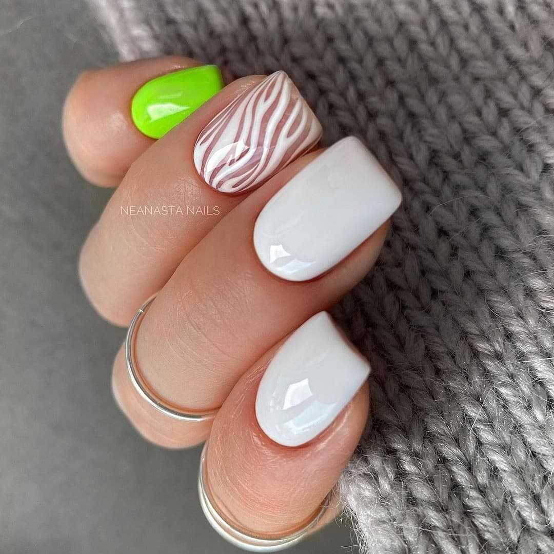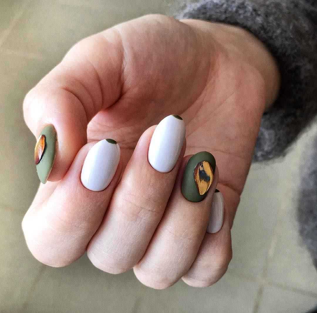 Молочный отлично смотрится с яркими цветами, такими как жемчуг или зеркальные поверхности. Используйте в дизайне отдельные блестящие ноготки рядом с матовыми.