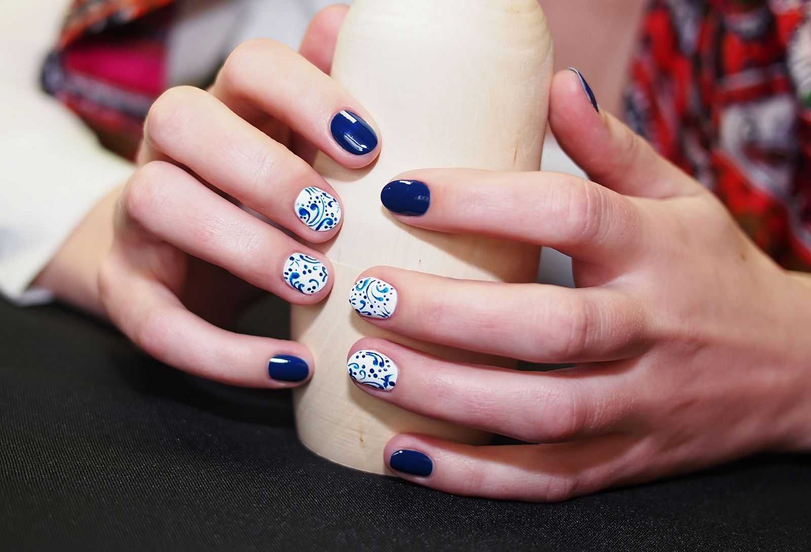 Помимо различного декора в последнее время набирает популярность дизайн с техникой гжель. Оригинальные цветочные узоры можно выполнить несколькими способами. При ручном выполнении роскошных цветочных завитков синего цвета необходимо использовать тоненькую кисточку. Более простым решением станет применение технологии стемпинг. Ну, и наконец самый легкий, но не менее удивительный эффект получается при использовании наклеек. Чаще всего гжелью выполняют несколько акцентных ноготков. При этом остальные ноготки выполняются насыщенным синим тоном. Роспись прекрасно смотрится на белой поверхности, и может быть выполнена как обычным лаком, так и блестками. Очень часто встречаются варианты со всеми пальчиками, расписанными гжелью. Такой маникюр не оставит равнодушной ни одну девушку.