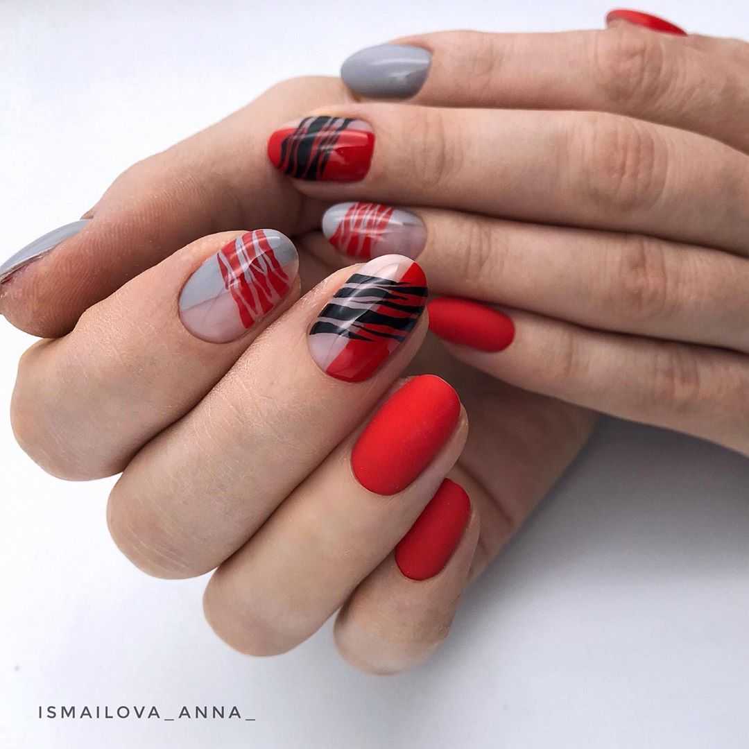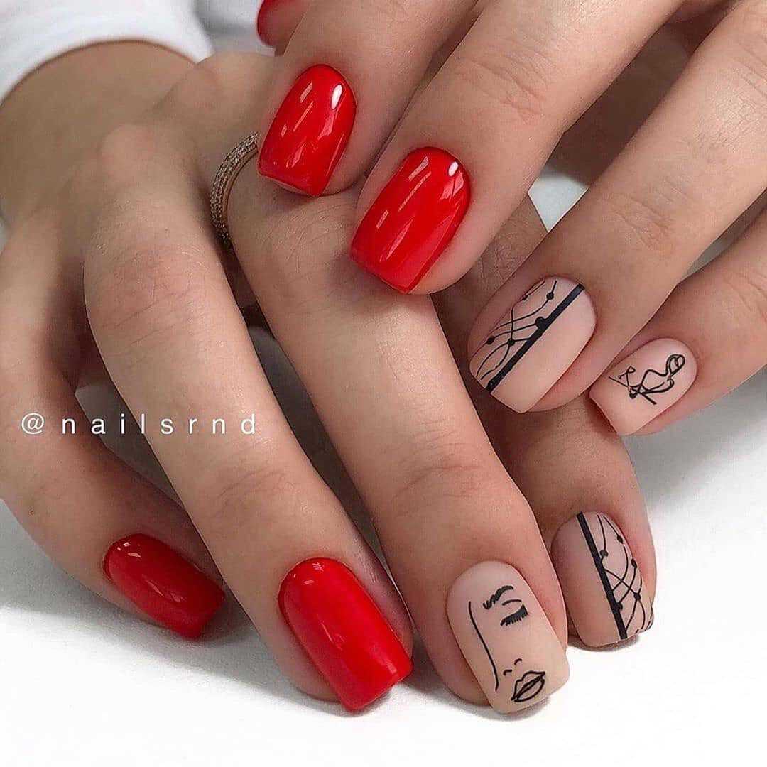 Для многих такое сочетание цветов кажется слишком смелым и броским. Но мастера маникюра в 2020 году подготовили множество разных дизайнов с использованием данных тонов, которые смотрятся на коротких ноготках непревзойденно и необычно. Такие сочетания выглядят гармонично при любом комбинировании. В основном самыми красивыми техниками считаются градиент и выполнение акцента на нескольких ноготках красным цветом. При этом на красной поверхности можно выполнить различные рисунки, дополнение стразами, бусинками и так далее. В этом году очень модными считаются разводы красно-синего цвета.