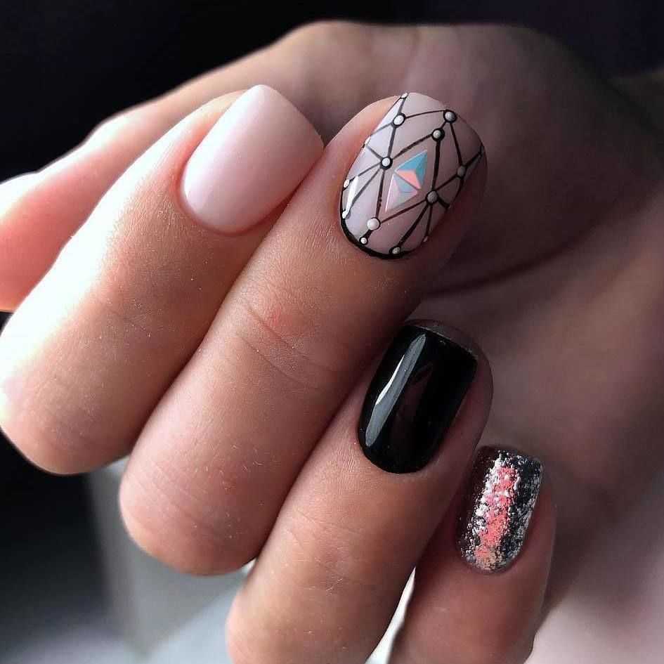 Яркий глиттер и блестки продолжают удивлять модниц утонченными и восхитительными идеями выполнения маникюра на коротких ногтях. На строгом черном фоне блестящие переливы будут выглядеть выгоднее всего. Самым актуальным является серебристый глиттер. Он прекрасно сочетается как с торжественными, так и с повседневными образами. Наиболее актуальный декор — это однотонное покрытие глиттером нескольких ноготков. Такой акцент удачно гармонирует с черной основой маникюра. Ещё одним вариантом станет выделение края ноготков серебристым декором. При помощи блесток очень часто выделяют узоры или рисунки.