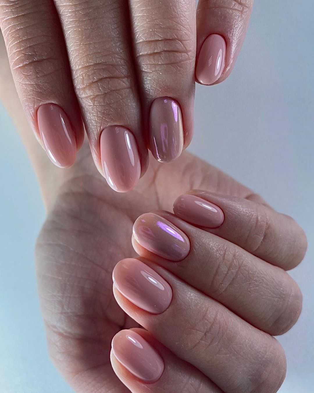 Прекрасным дополнением к молочному маникюру станет зеркальный металлик. Втирка выгодно подчеркнет базовый оттенок. Ее можно использовать чтобы выделить несколько ногтей, а не использовать по всему маникюру.