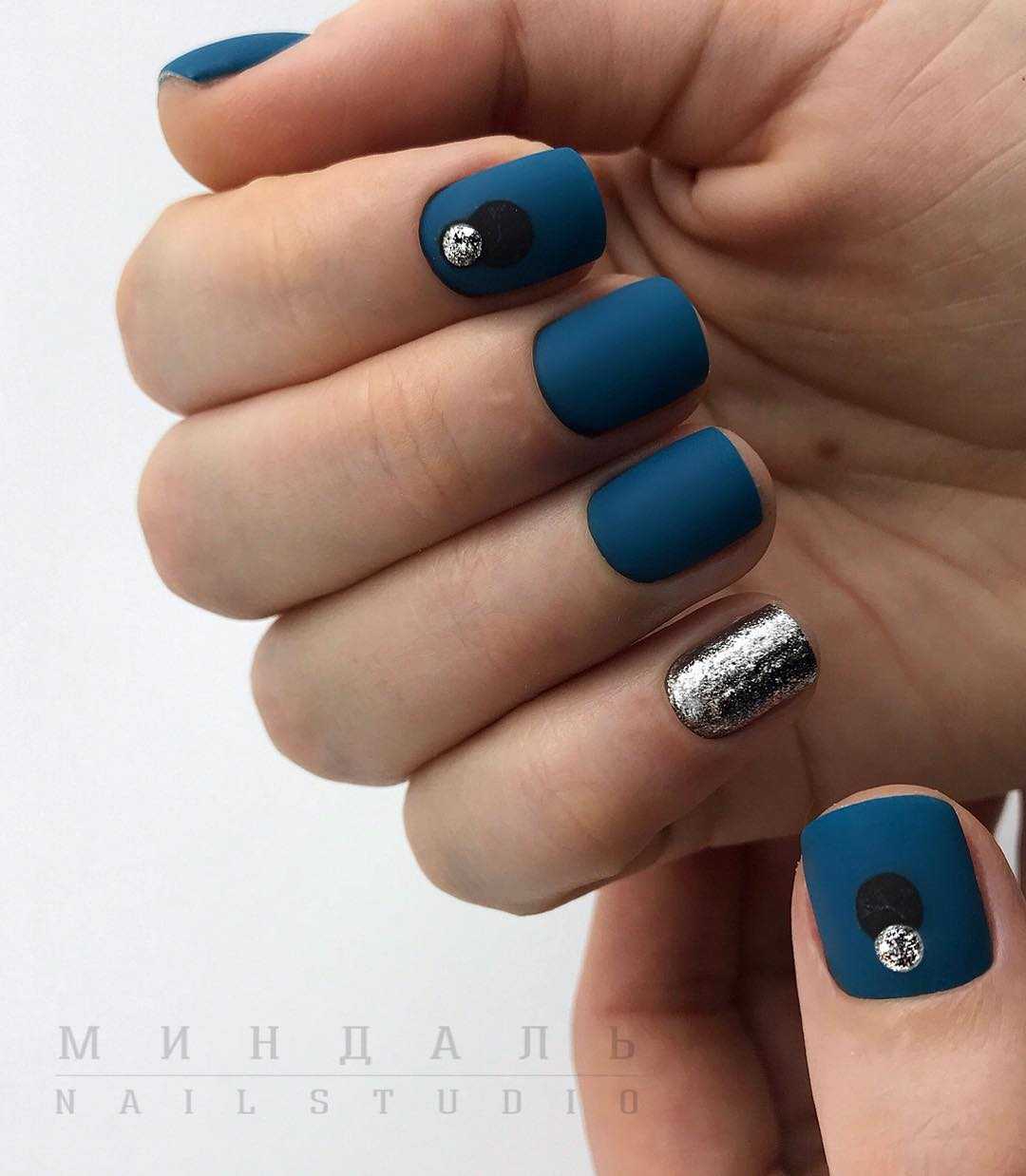 Синий маникюр будет выглядеть безупречно и роскошно на ноготках короткой длины, особенно если выполнить дизайн в утонченном матовом исполнении. Наиболее чарующе выглядят в матовом покрытии яркие тона синего цвета. В бархатном исполнении они смотрятся эффектнее и благороднее. Матовую текстуру можно использовать на всех ноготках, при этом разбавляя ненавязчивый дизайн стразами, камнями и другими элементами. Не менее привлекательно выглядит и выполнение нескольких пальчиков матовым тоном, а остальные — любой другой техникой. Для разнообразия дизайна можно нанести легкие глянцевые узоры на матовую поверхность синего цвета.