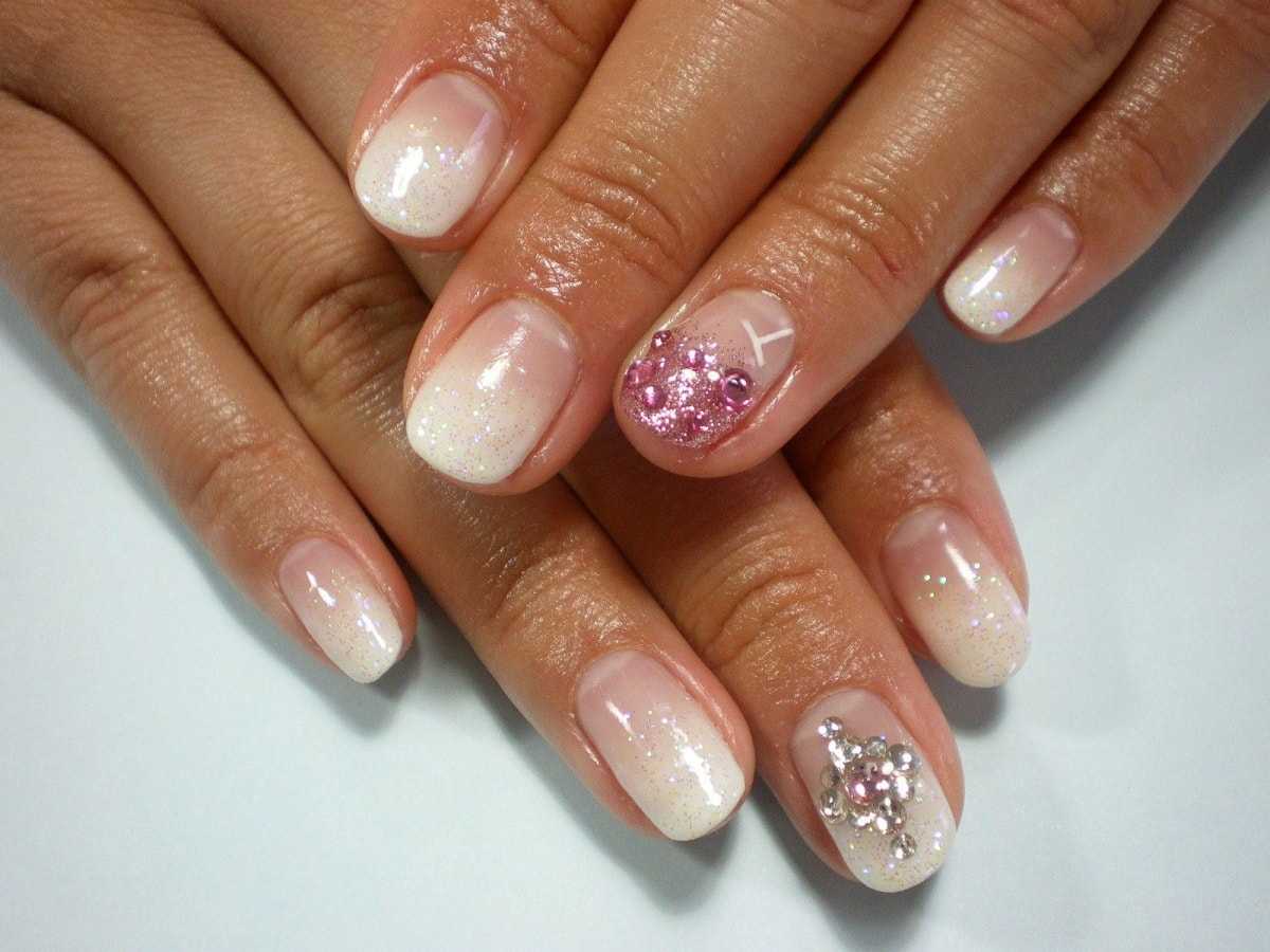 свадебный маникюр френч 2018 с персиковым фоном и стразами