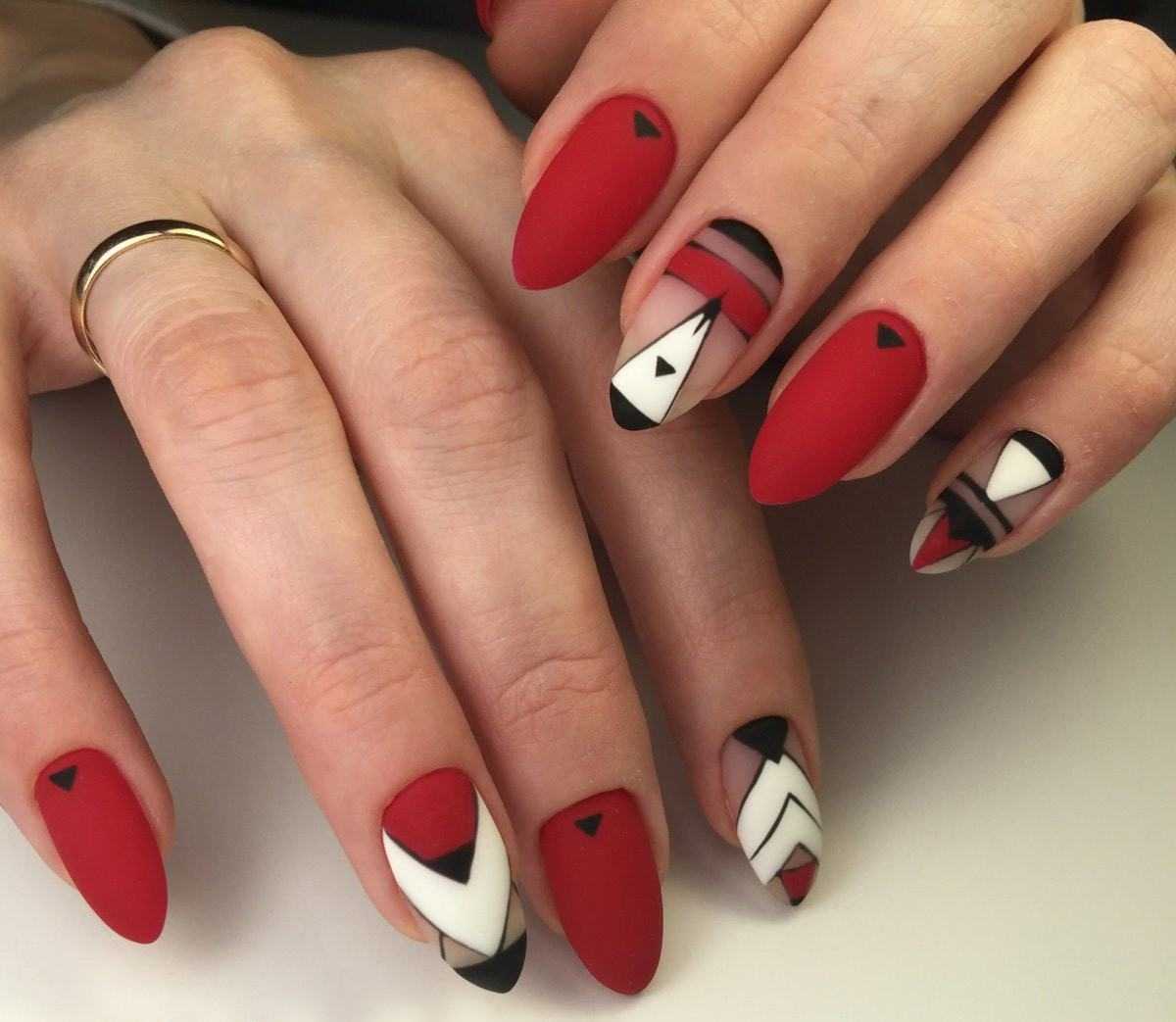 Шикарно выглядит геометрия в красных тонах, поэтому она также в почете у модниц. Красивый и не вызывающий результат получится на миндалевидных ногтях короткой или средней длины. Наиболее удачными комбинациями с красным будут белый, черный, золотой и розовый цвета.