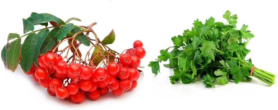 Маска с рябиной и петрушкой активно борется с пигментацией и веснушками. По чайной ложке лимонного сока, спирта или водки, рябинового сока и петрушки в виде сока смешивают вместе. Спиртовой рябиново-петрушечный раствор достаточно агрессивный для дермы. Его точечно втирают ватной палочкой на темные участки.