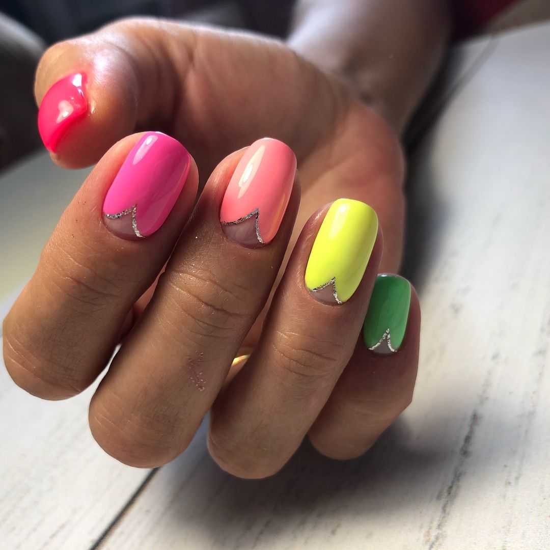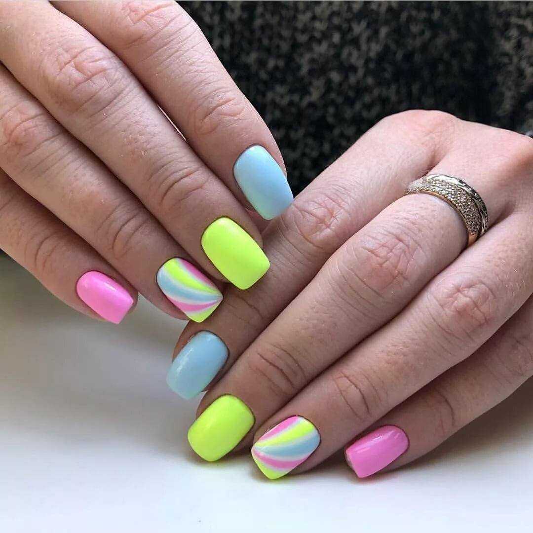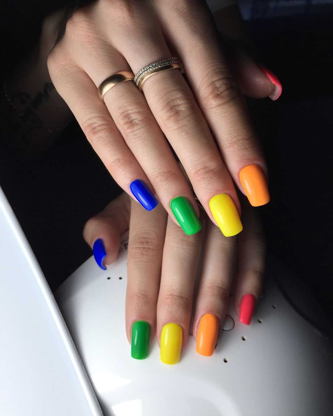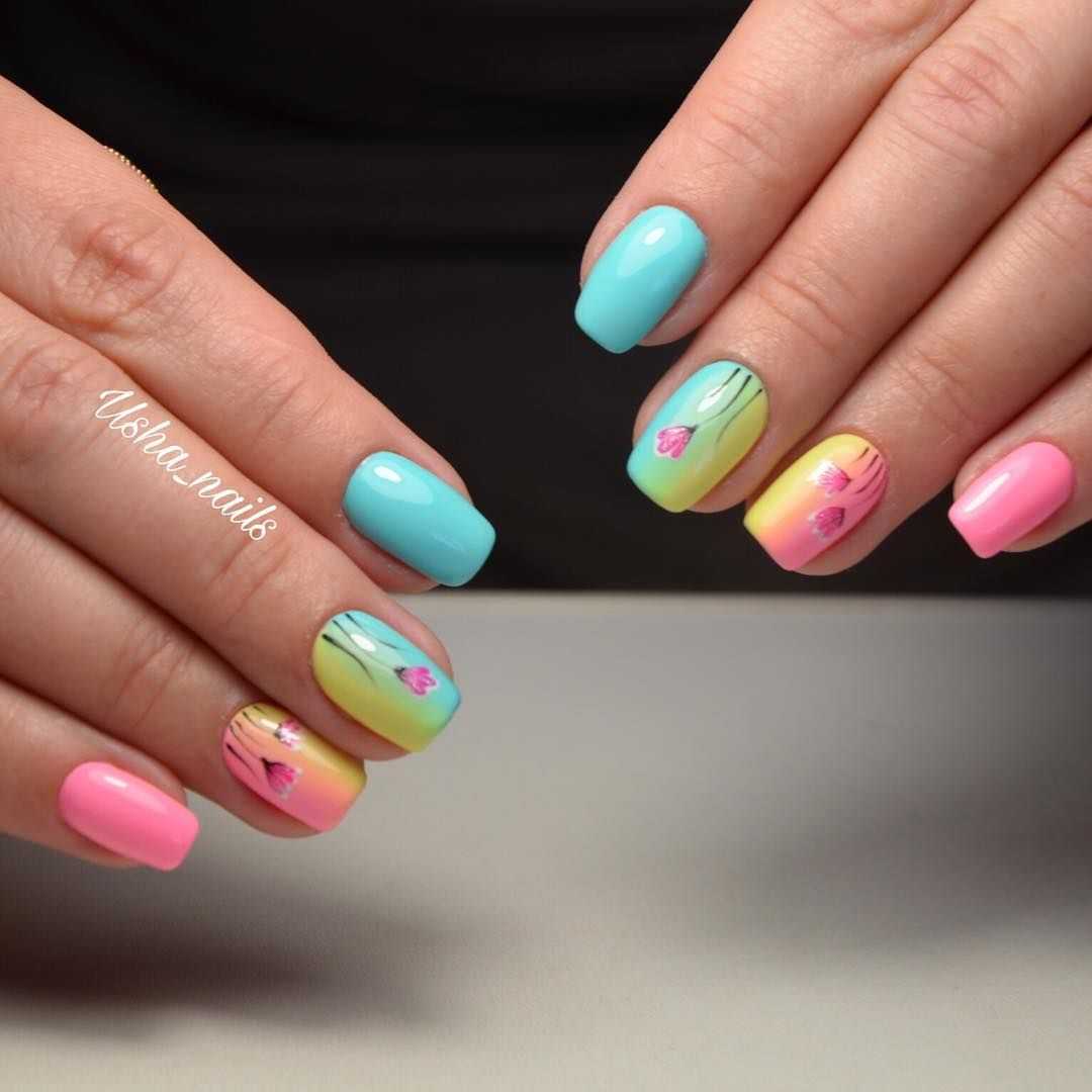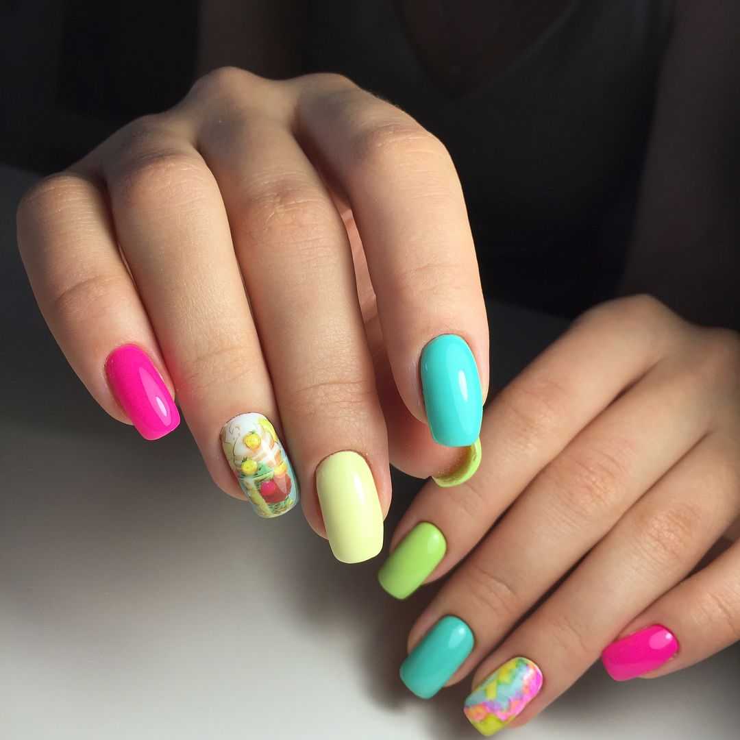 Цветные нейл-арты – настоящая находка для девушек, которые не прочь поэкспериментировать с интересным декором. Маникюр в ярких насыщенных или, наоборот, сдержанных оттенках отлично впишется в летний образ, который чаще всего изобилует светлыми оттенками.