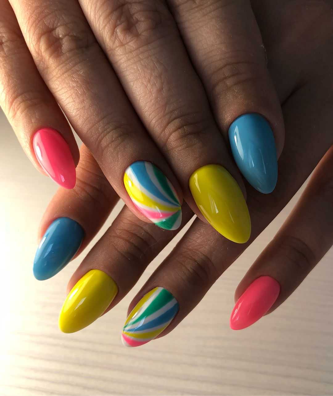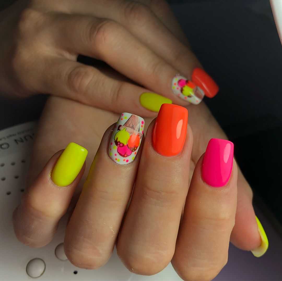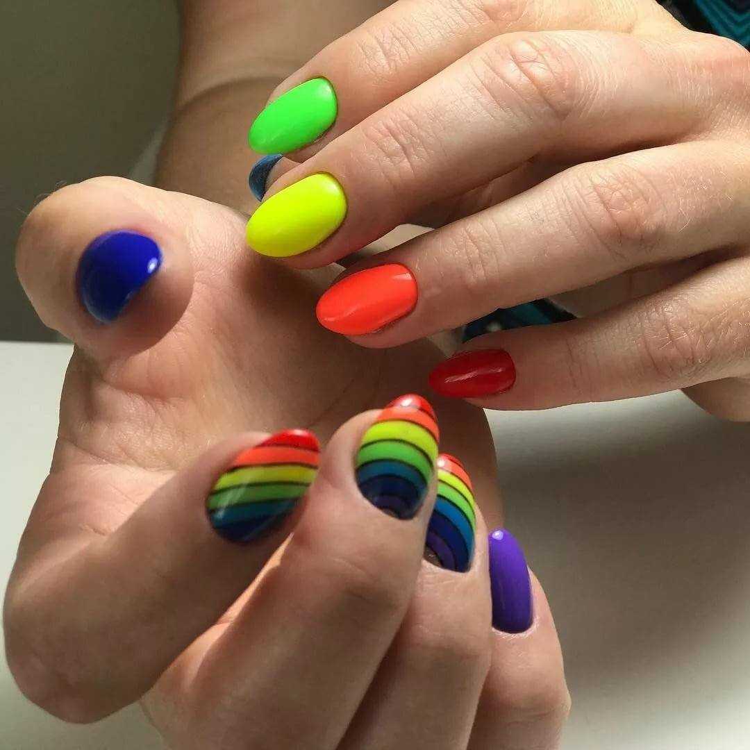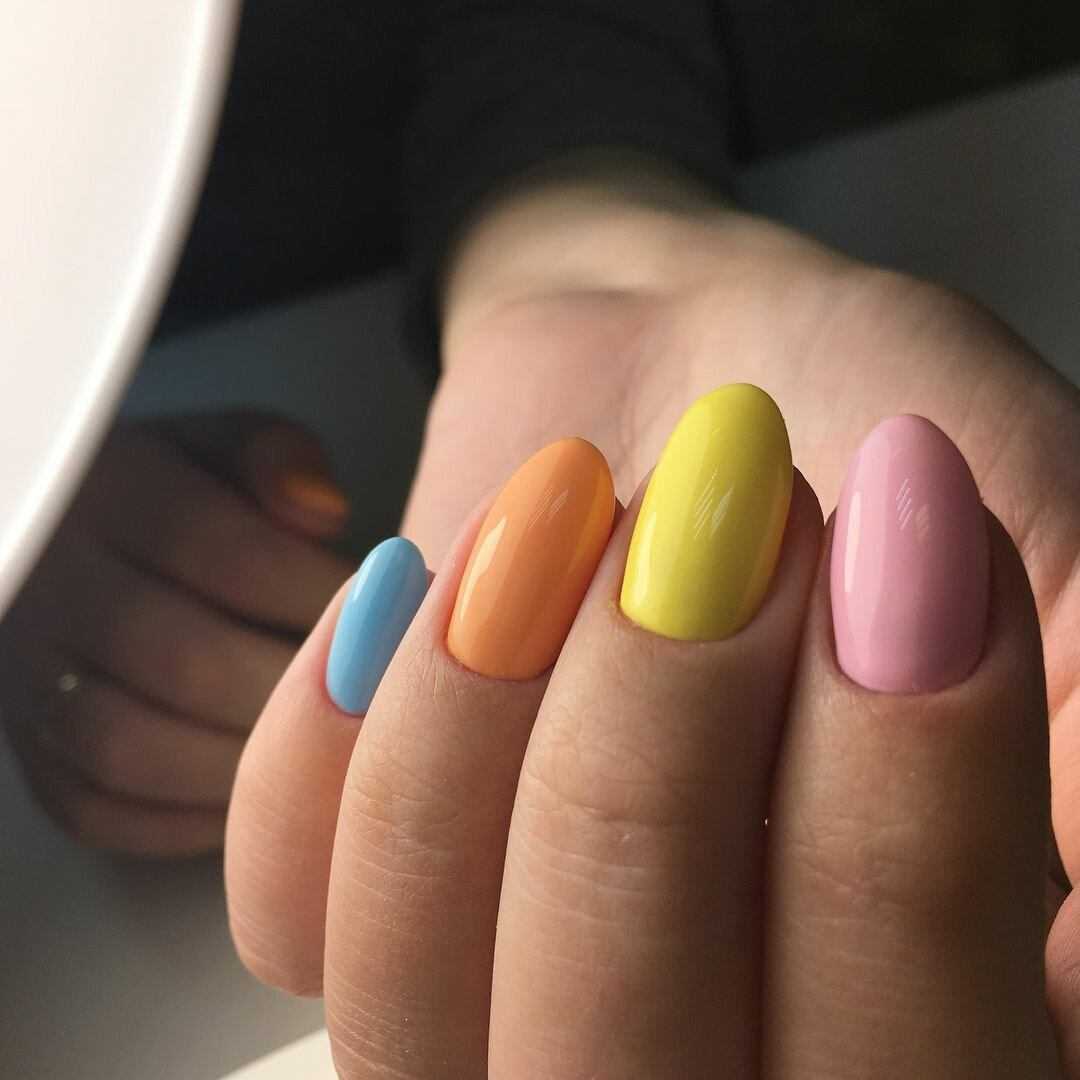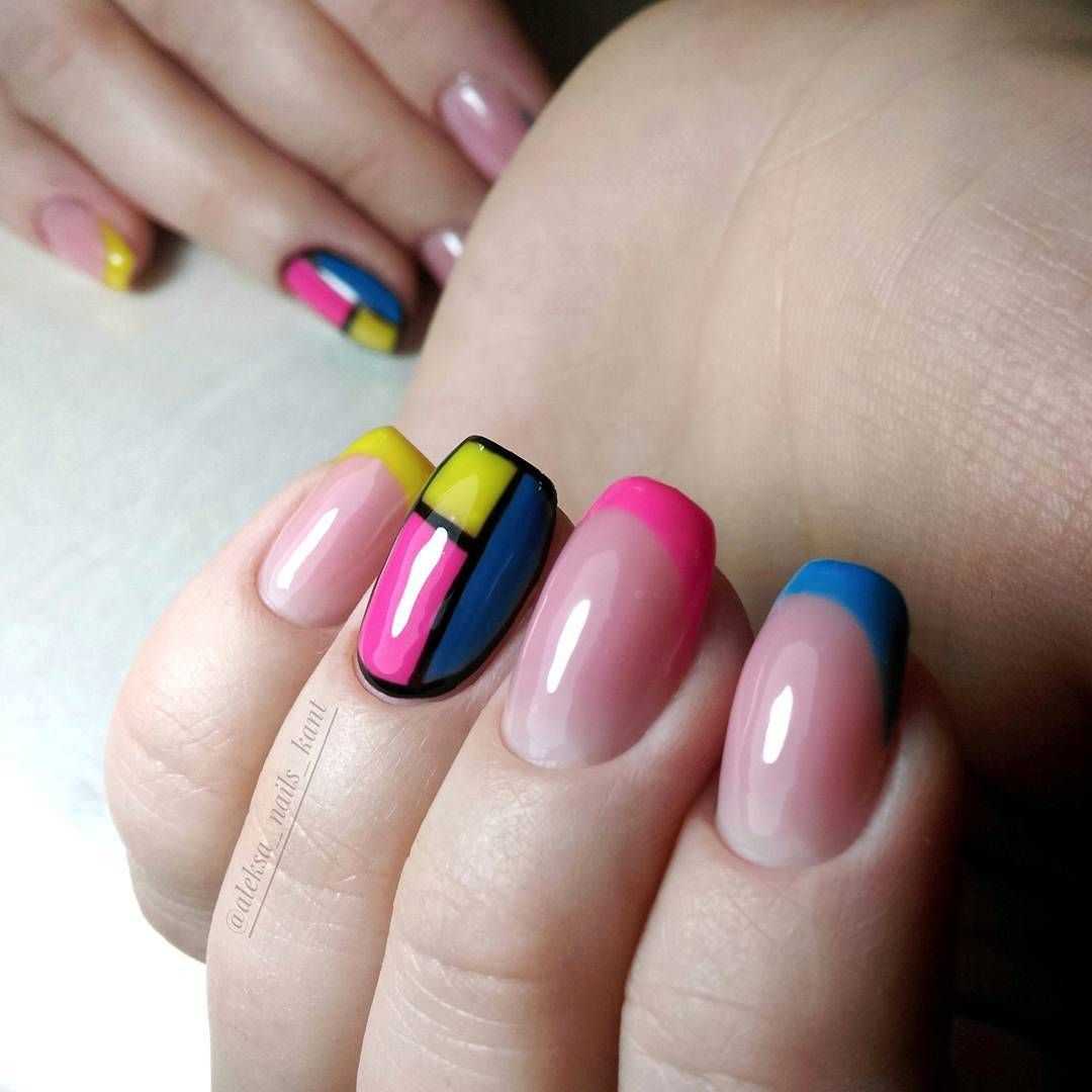 Цветные нейл-арты – настоящая находка для девушек, которые не прочь поэкспериментировать с интересным декором. Маникюр в ярких насыщенных или, наоборот, сдержанных оттенках отлично впишется в летний образ, который чаще всего изобилует светлыми оттенками.