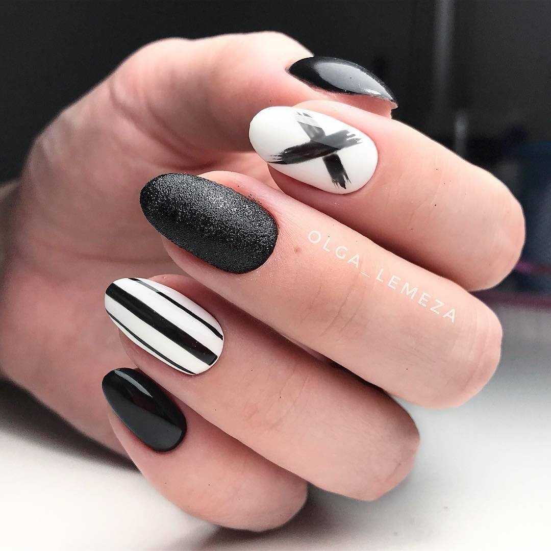 Соединение тех или иных оттенков может дать весьма оригинальный результат. Контрастные нейл-арты выглядят объемно, интересно и заметно. Самое популярное и часто используемое сочетание – это черный и белый. Этот тандем позволяет создать множество стильных нейл-артов, например, отлично смотрится французский маникюр в черно-белом цвете, однотонное покрытие, нейл-арты с геометрией, флористикой, хищным декором.