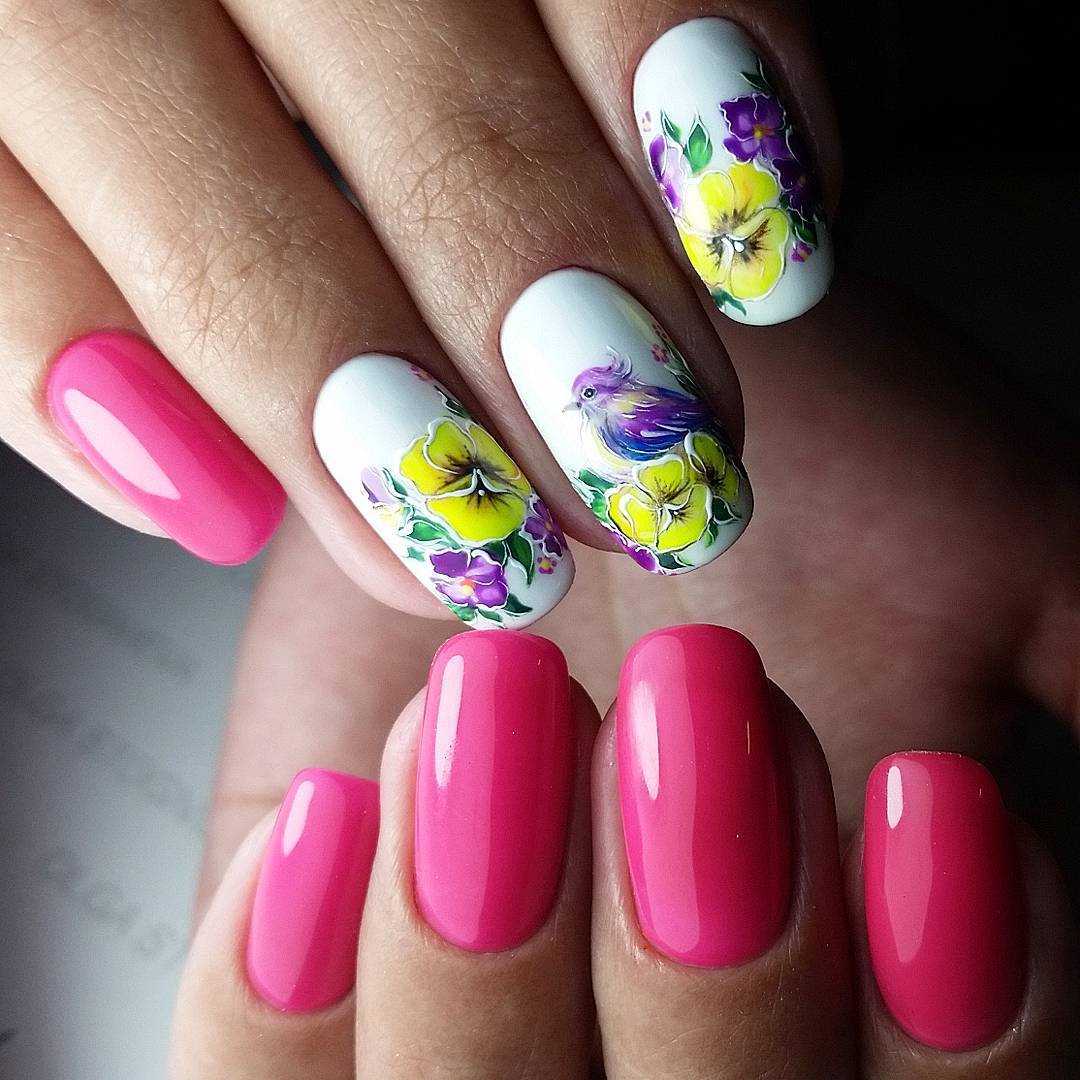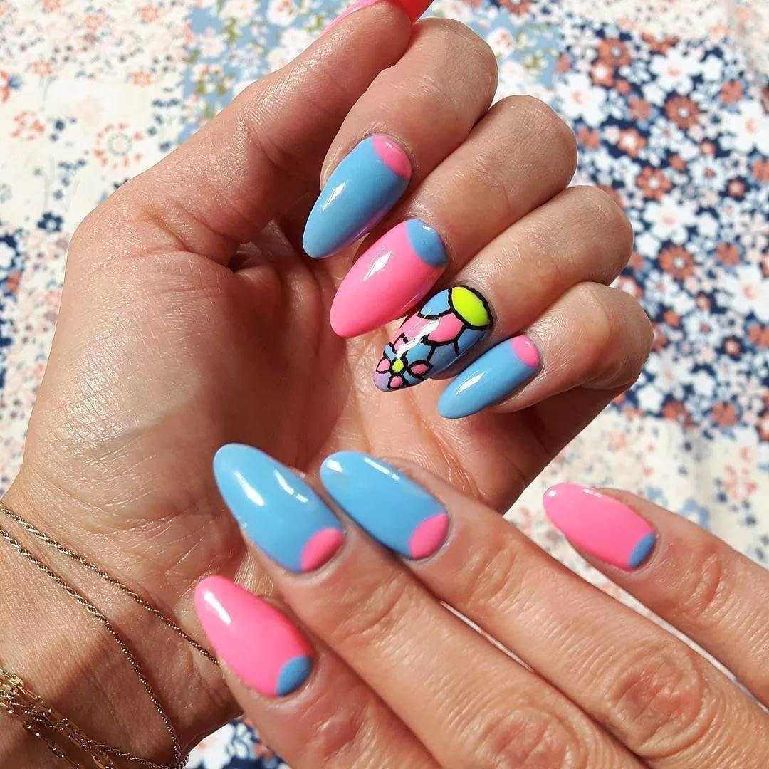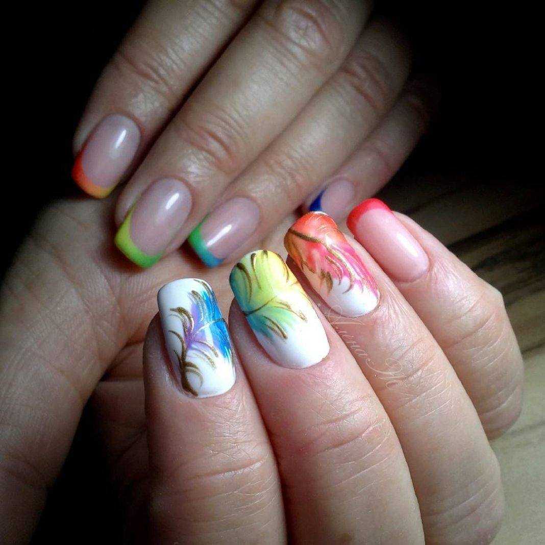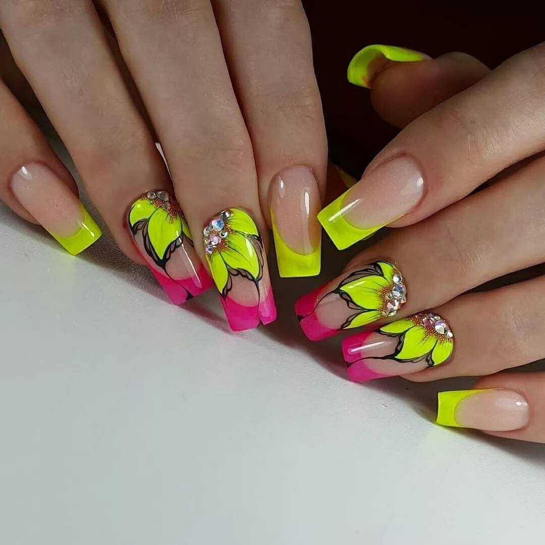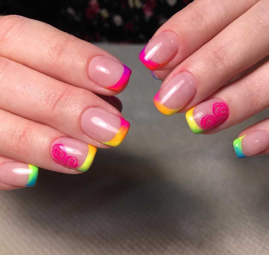 Цветной френч отлично сочетается с флористикой. Маникюр смотрится ярко и броско, особенно если декор также выполнен в сочных оттенках. Цветной френч лучше выполнять на длинных квадратных или миндальных ногтях. На такой «длине» получится сделать широкую «улыбку» и показать красивый цветной градиент.