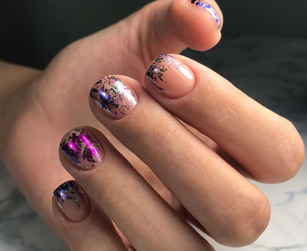 Отдельно стоит отметить декоративные детали, которые так часто используются в маникюре. Фольгированные оттиски или вставки в виде скотч-ленты, камифубуки, «битого стекла» придают ноготкам особый шик. Но в целом это зависит от количества деталей. То есть в результате маникюр может быть как повседневным, так и торжественным