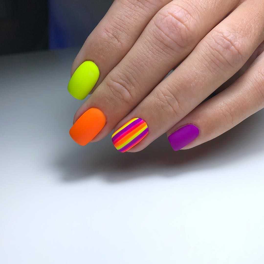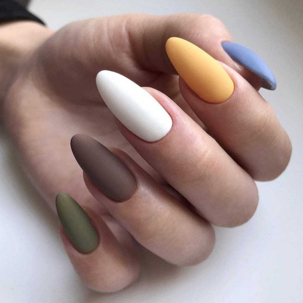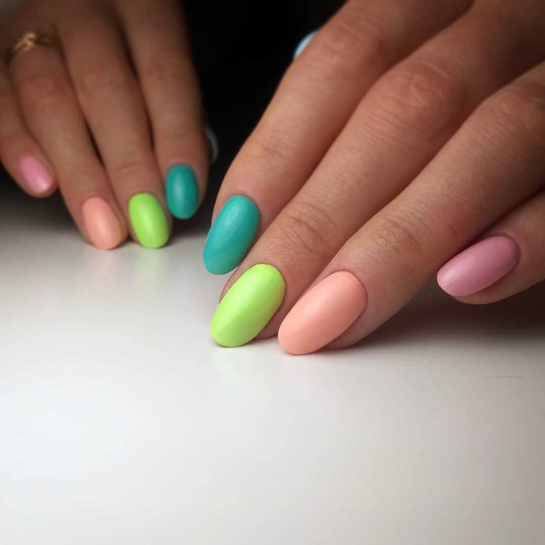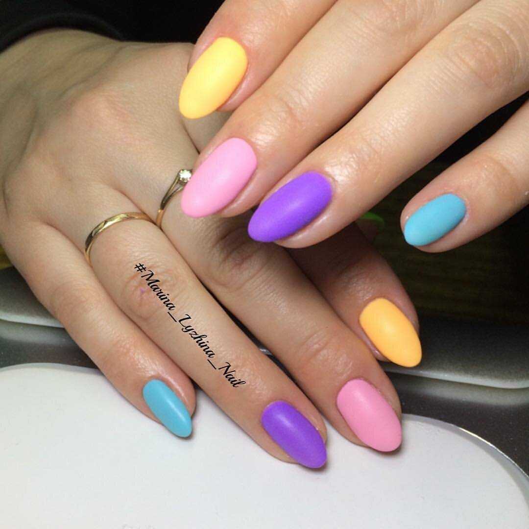 Что касается цветного маникюра, то матовость ему только к лицу. Даже такие сочные оттенки как лимонный, лайм, бирюзовый, оранжевый можно выполнить в матовой текстуре. В тренде однотонное покрытие цветными гель-лаками, разноцветный маникюр, маникюр «разные ручки».