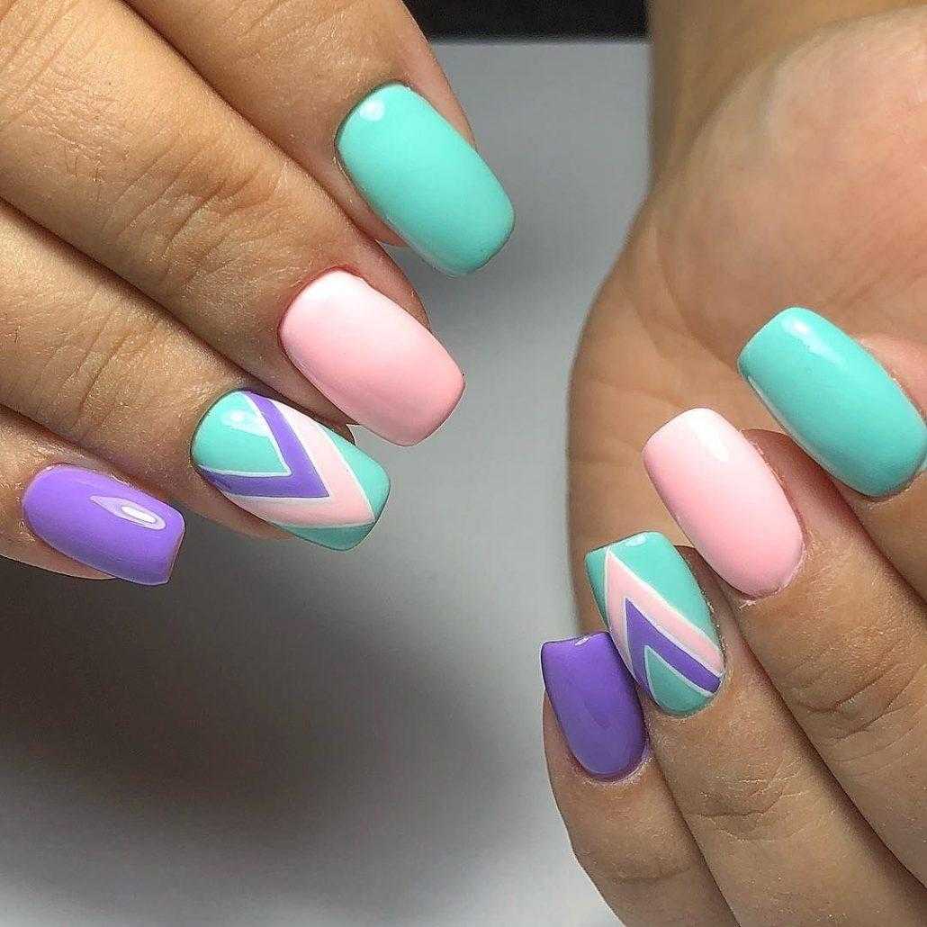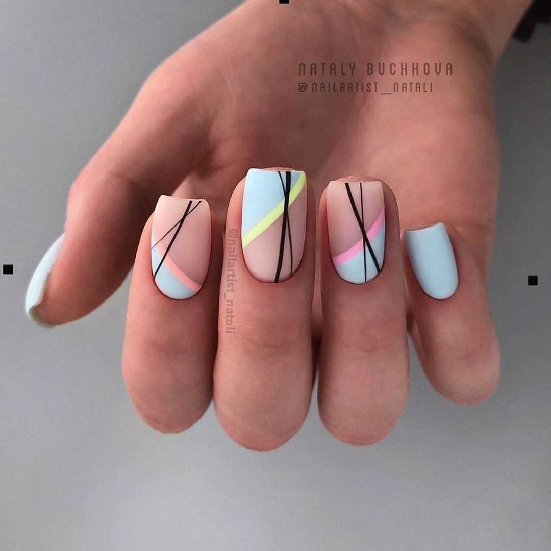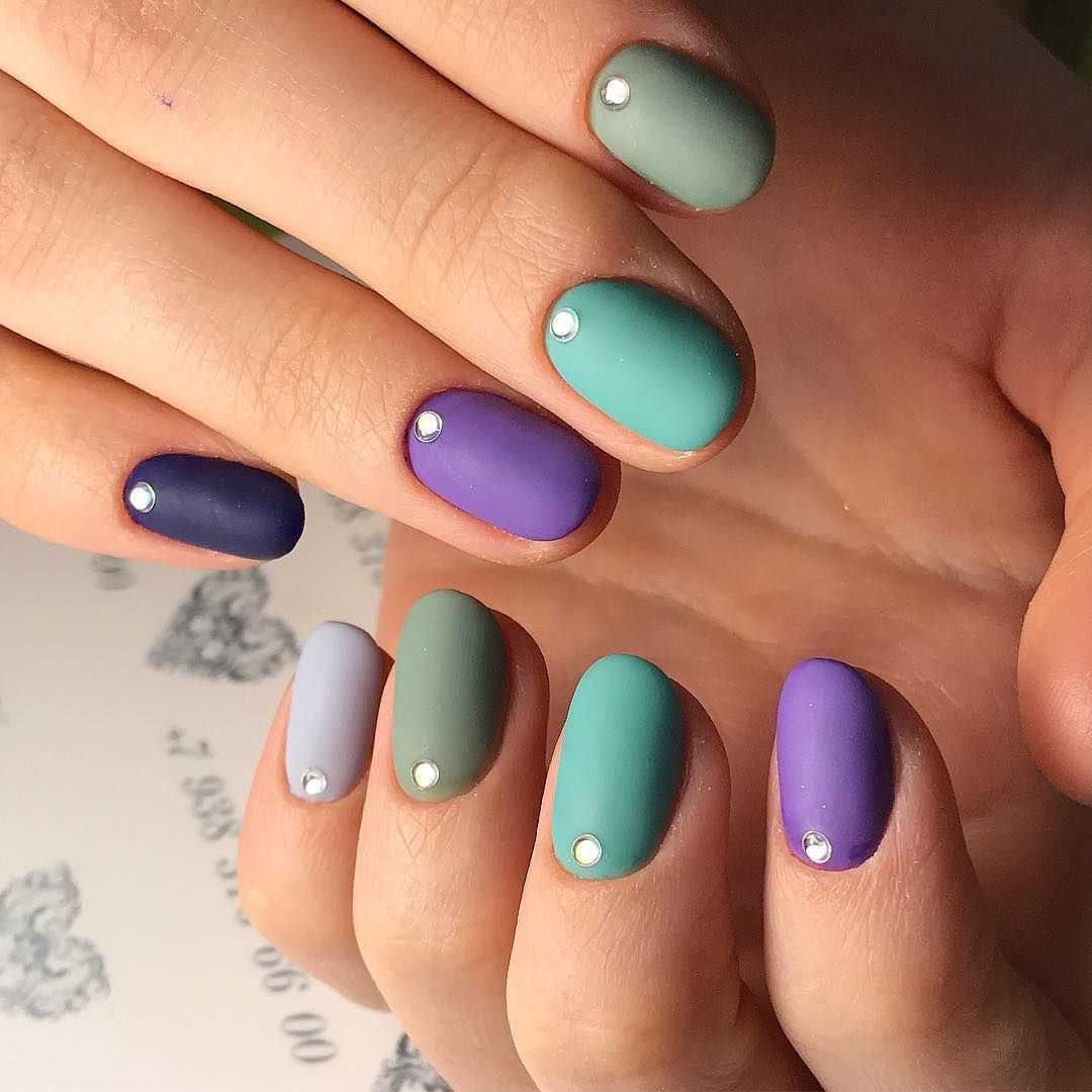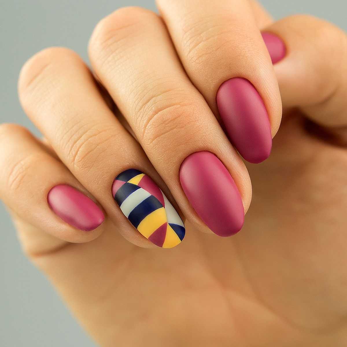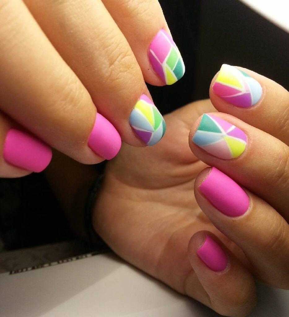 Матовый цветной маникюр практически не нуждается в дополнительном декоре. Если количество оттенков в дизайне превышает 3, то лучше не дополнять его стразами, слайдерами или стемпингом. Шикарно выглядят нейл-арты с геометрическими узорами. При этом также стоит придерживаться умеренности и выполнять вместо сложных узоров с треугольниками и ромбами, дизайн со штрихами, мазками, тонкими линиями.