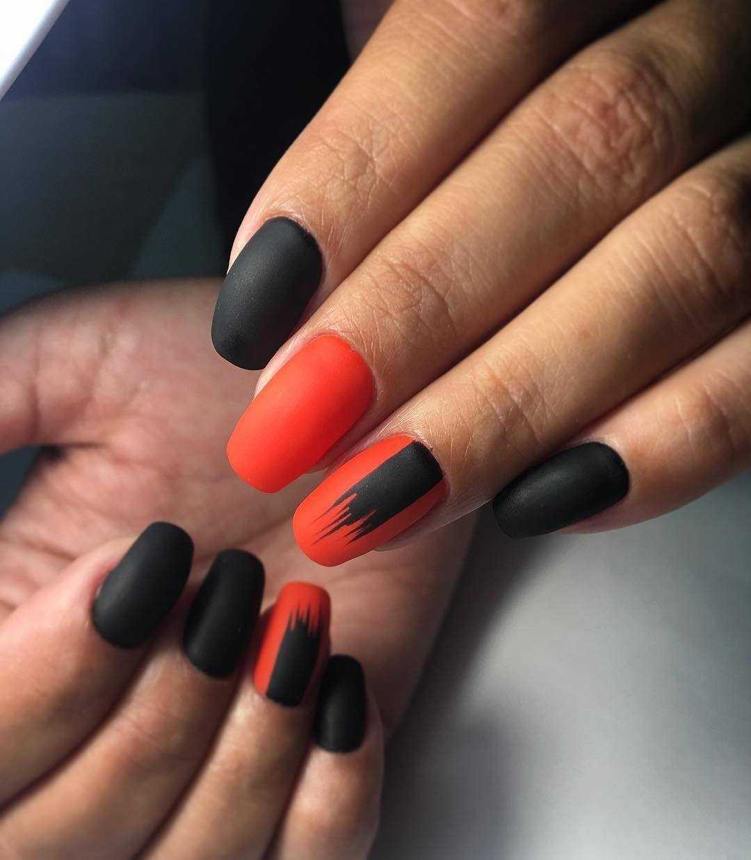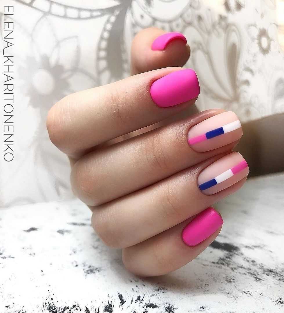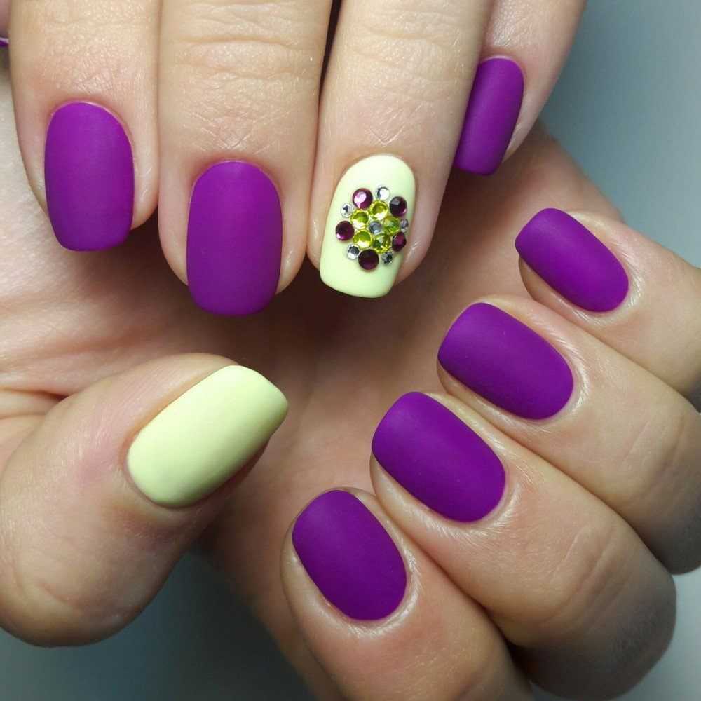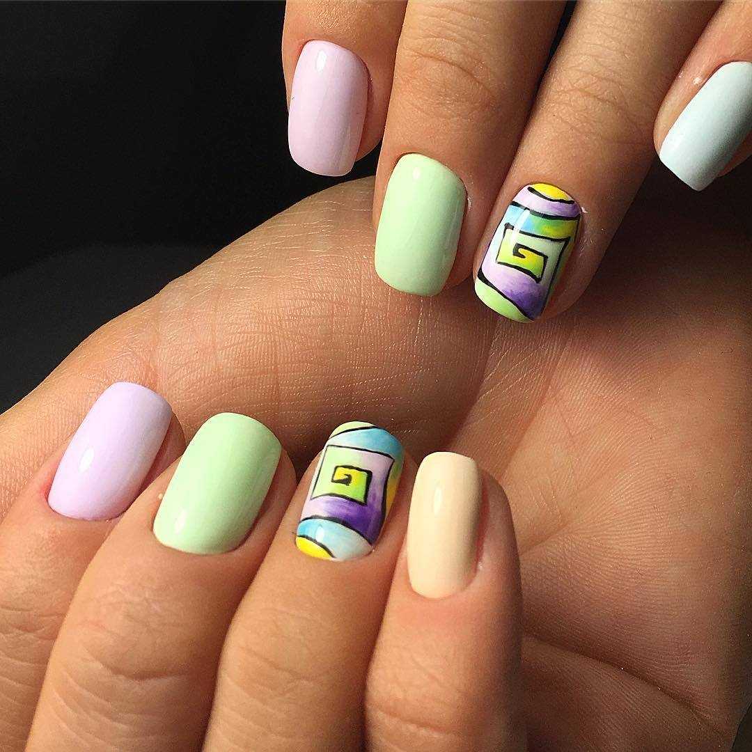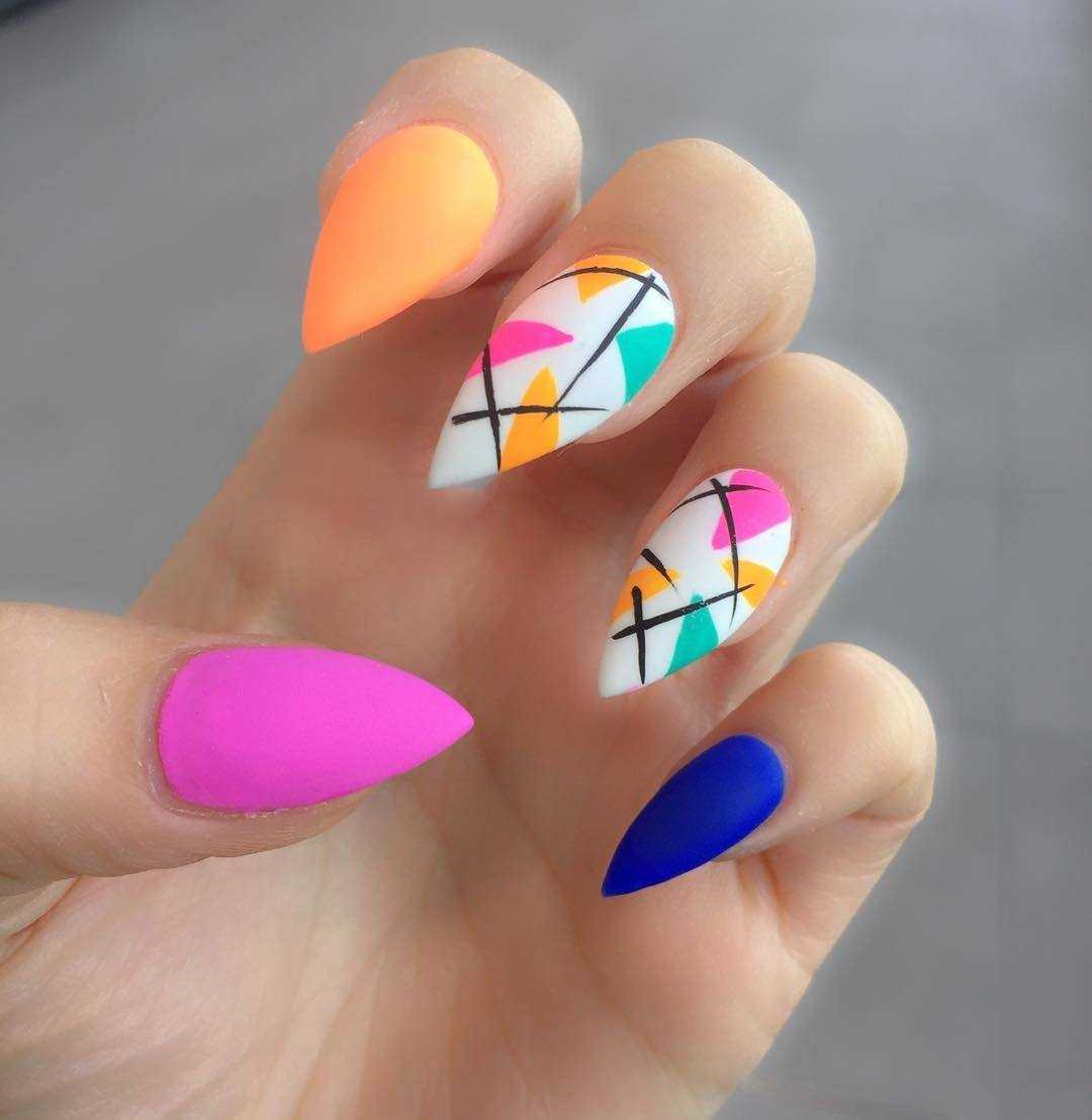 Матовый цветной маникюр практически не нуждается в дополнительном декоре. Если количество оттенков в дизайне превышает 3, то лучше не дополнять его стразами, слайдерами или стемпингом. Шикарно выглядят нейл-арты с геометрическими узорами. При этом также стоит придерживаться умеренности и выполнять вместо сложных узоров с треугольниками и ромбами, дизайн со штрихами, мазками, тонкими линиями.