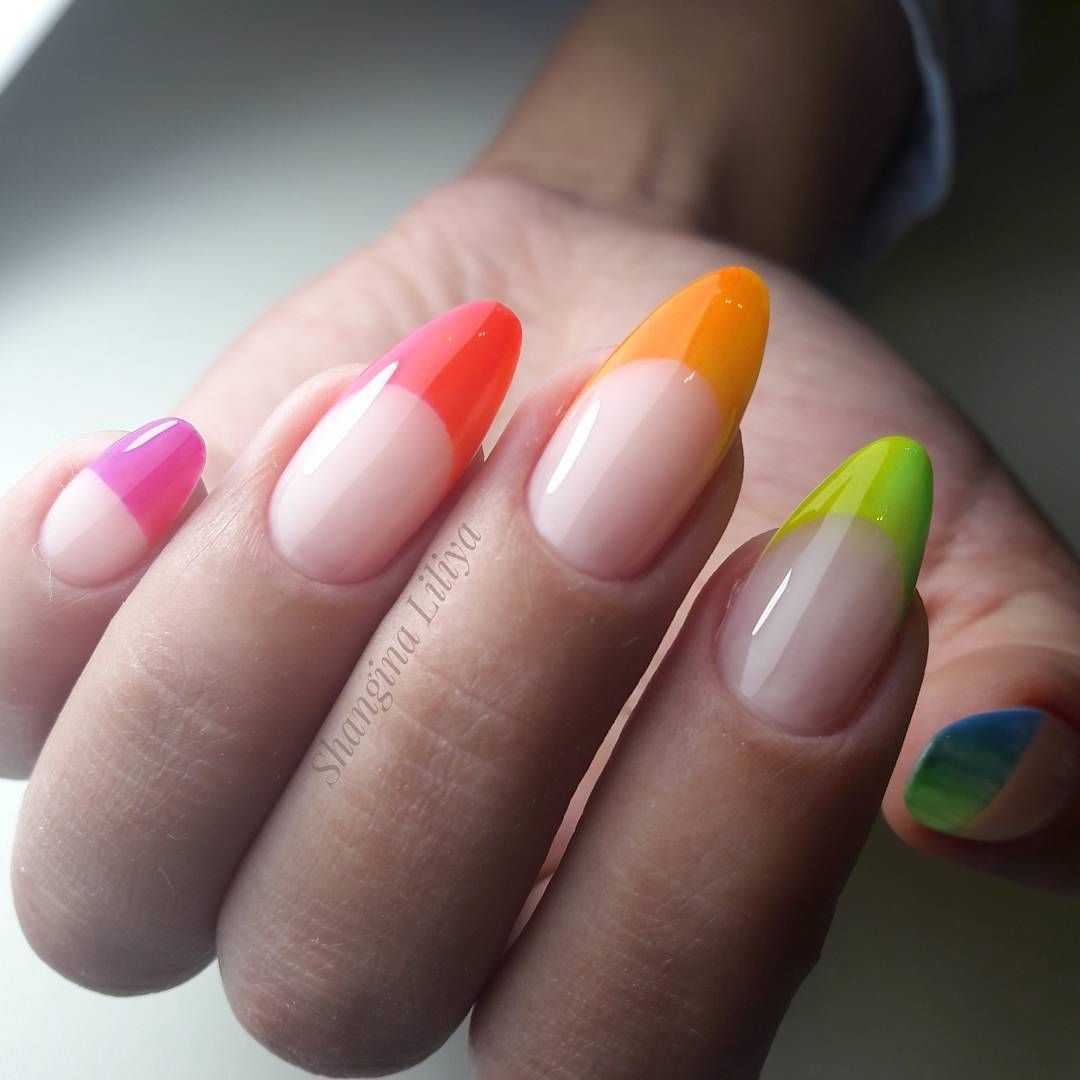 Цветной френч – отличная идея для весеннего и летнего образа. В цветном френче край ногтя выделен любым цветным гель-лаком или сразу несколькими оттенками, выполненными в градиентной технике.