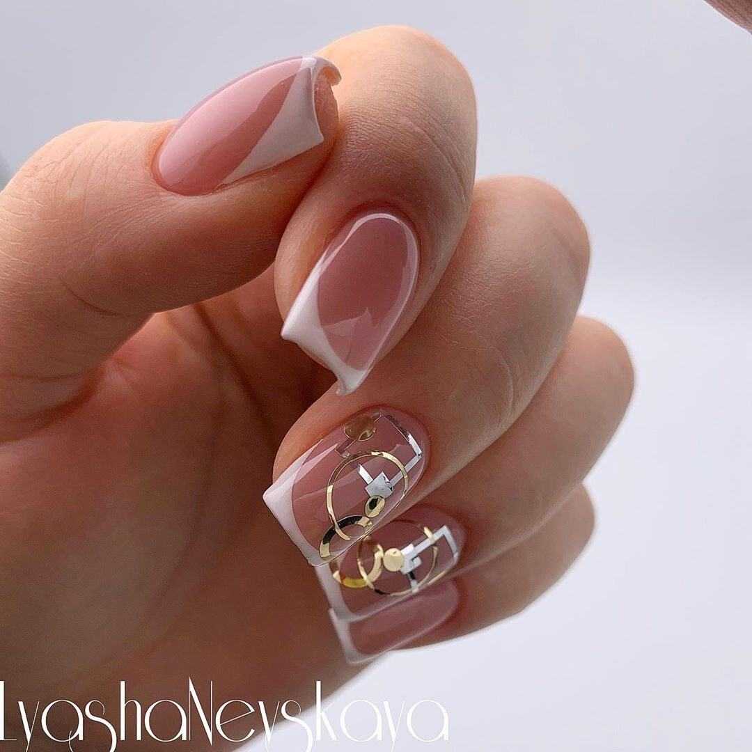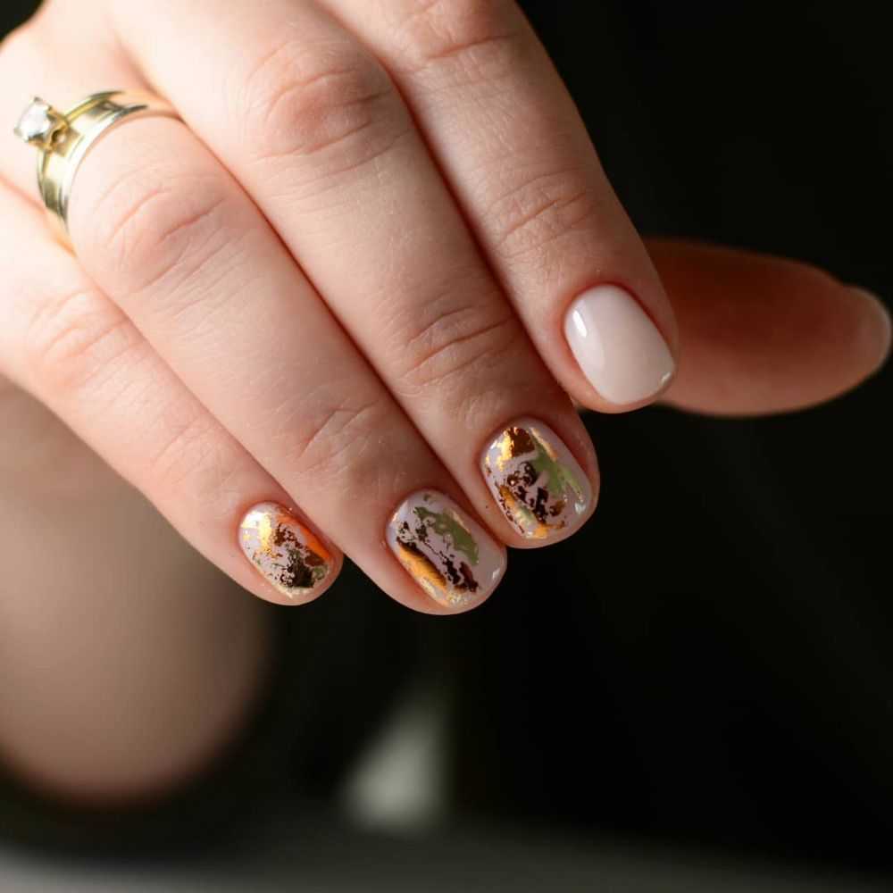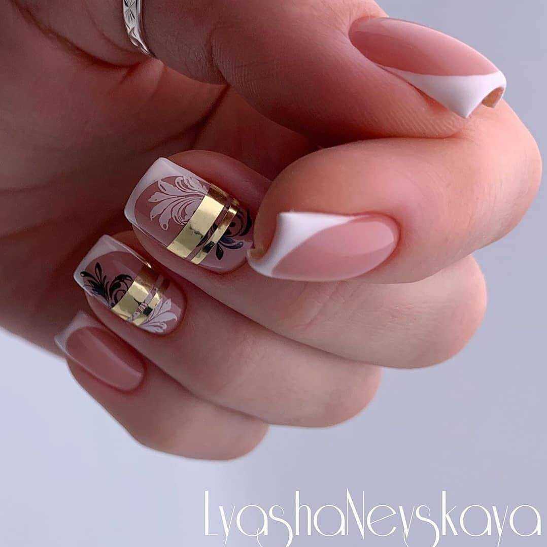 Такой маникюр смотрится сдержанно и лаконично. Необязательно заполнять им весь ноготь полностью, можно нанести золото на свободный край в виде френча или лунного маникюра.