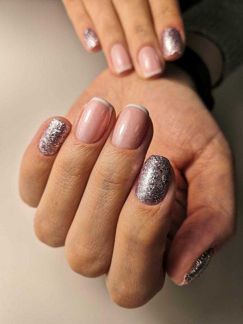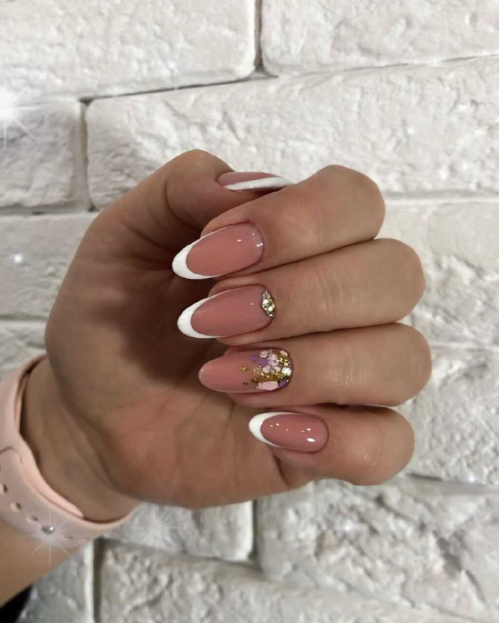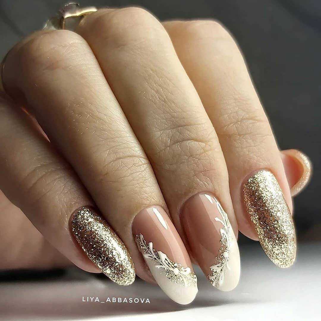 Такой маникюр смотрится сдержанно и лаконично. Необязательно заполнять им весь ноготь полностью, можно нанести золото на свободный край в виде френча или лунного маникюра.