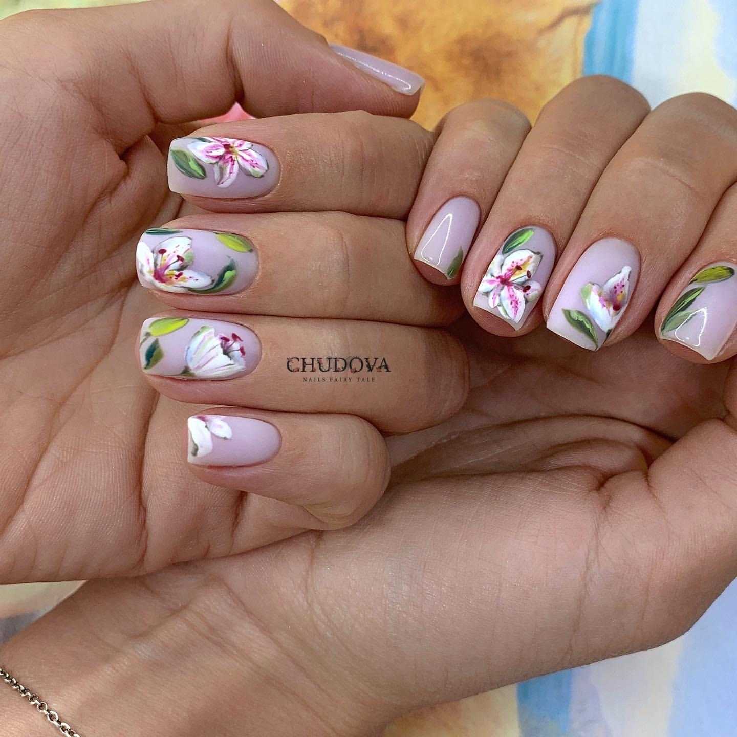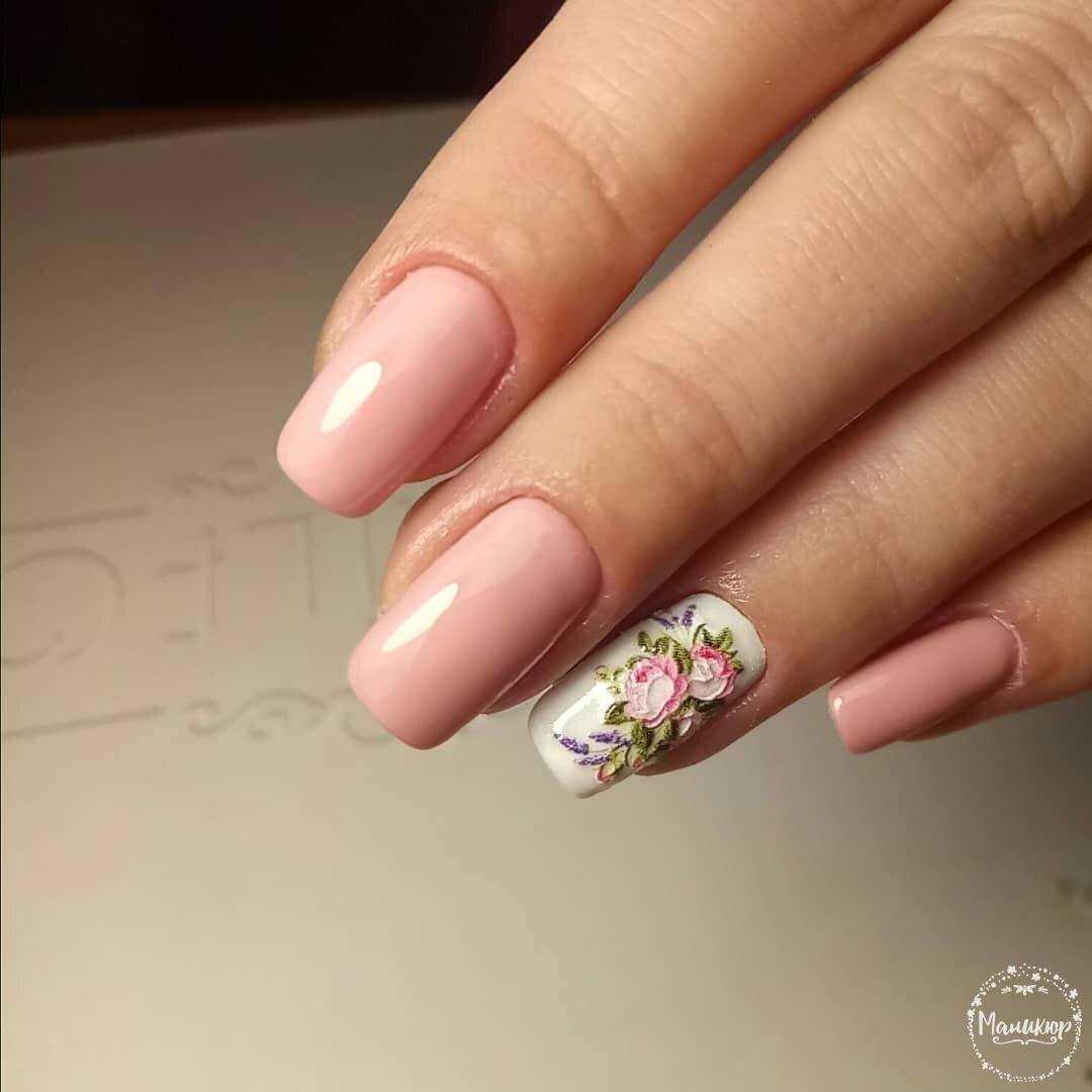 Одним из неоспоримых лидеров в дизайне бежевого маникюра, являются различные флористические мотивы на ногтях, выполненные в технике акварель, при помощи наклеек или стемпинга. Бежевый цвет уникально сочетается со многими оттенками