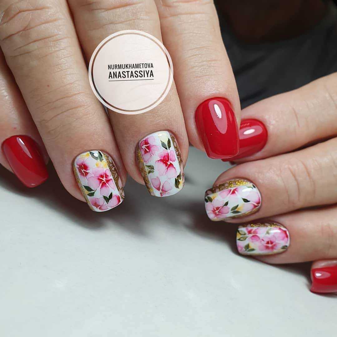 Оригинально выглядит сочетание белого и красного. Такой дизайн точно не останется незамеченным. Что касается техник маникюра, то интересно выглядит геометрический дизайн в красно-белом цвете, дизайн с фольгой. Присмотритесь к нейл-артам с флористикой. Дизайн с цветами 2020 – это нежные и лаконичные идеи, где декор занимает незначительное пространство ногтевой пластины. Если вы решили выполнить красно-белый маникюр с цветами, то рисуйте аккуратные нежные узоры с веточками, бутонами и листьями.
