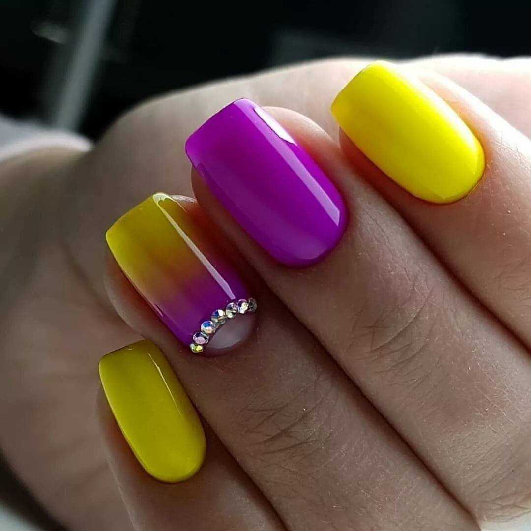 Для градиентного френча выбирается вся яркая палитра оттенков. Это может быть желтый, фиолетовый, красный, голубой оттенки. Остальная часть ногтя окрашивается в полупрозрачный едва заметный оттенок, в розовый или светло-коричневый цвет.