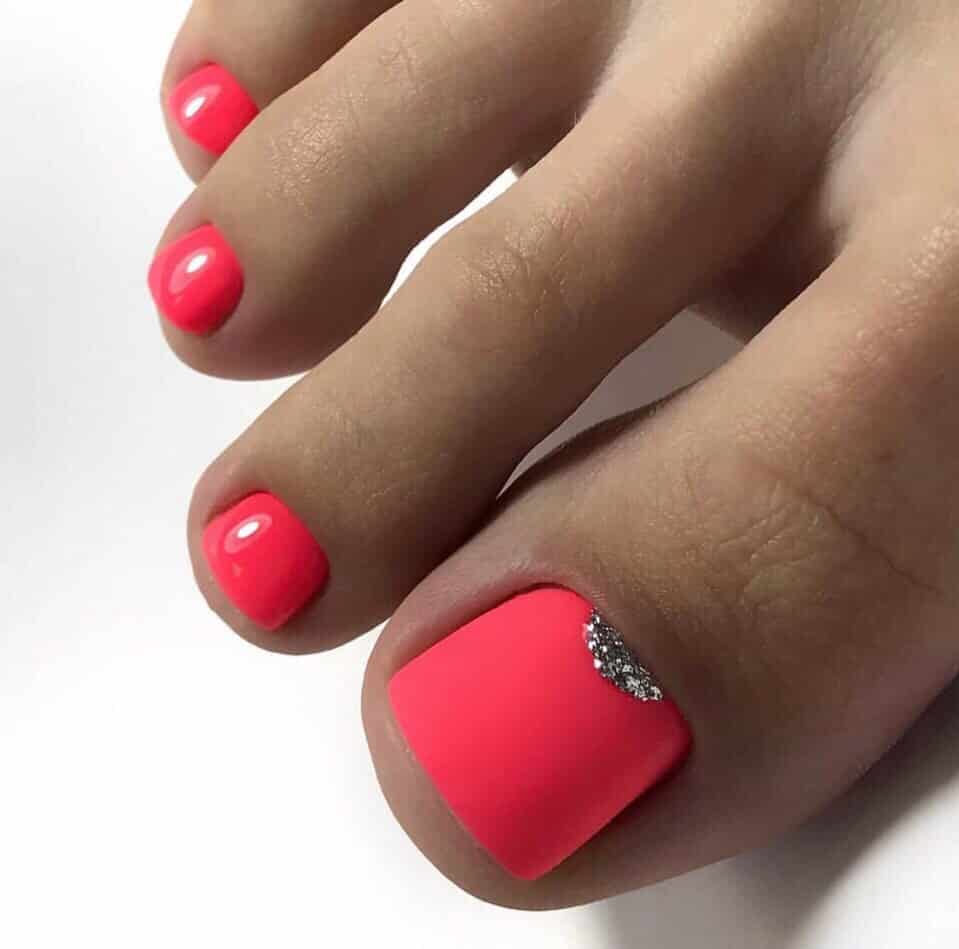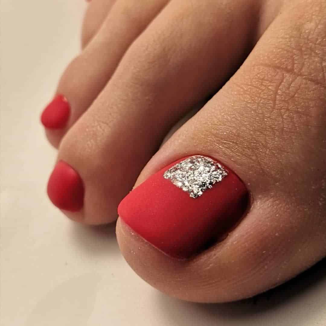 Красный педикюр с мерцающими элементами