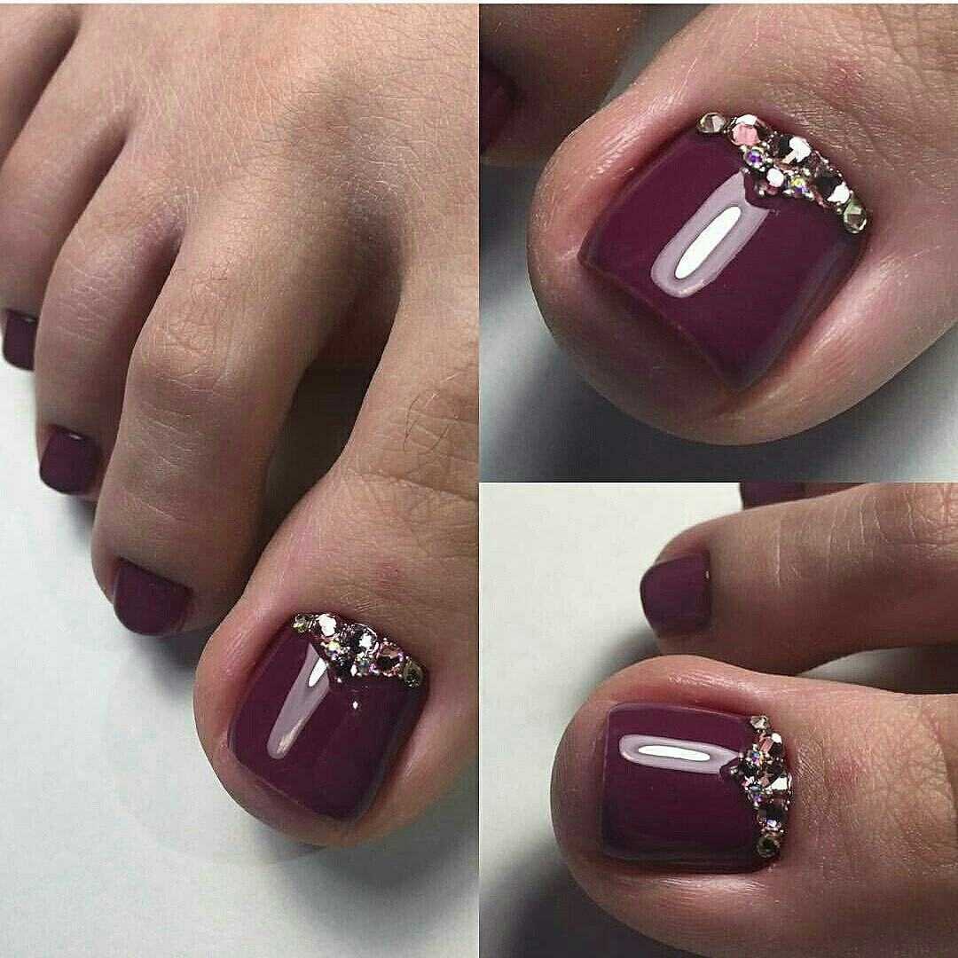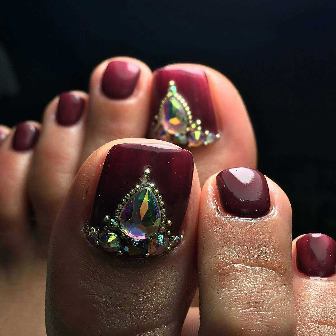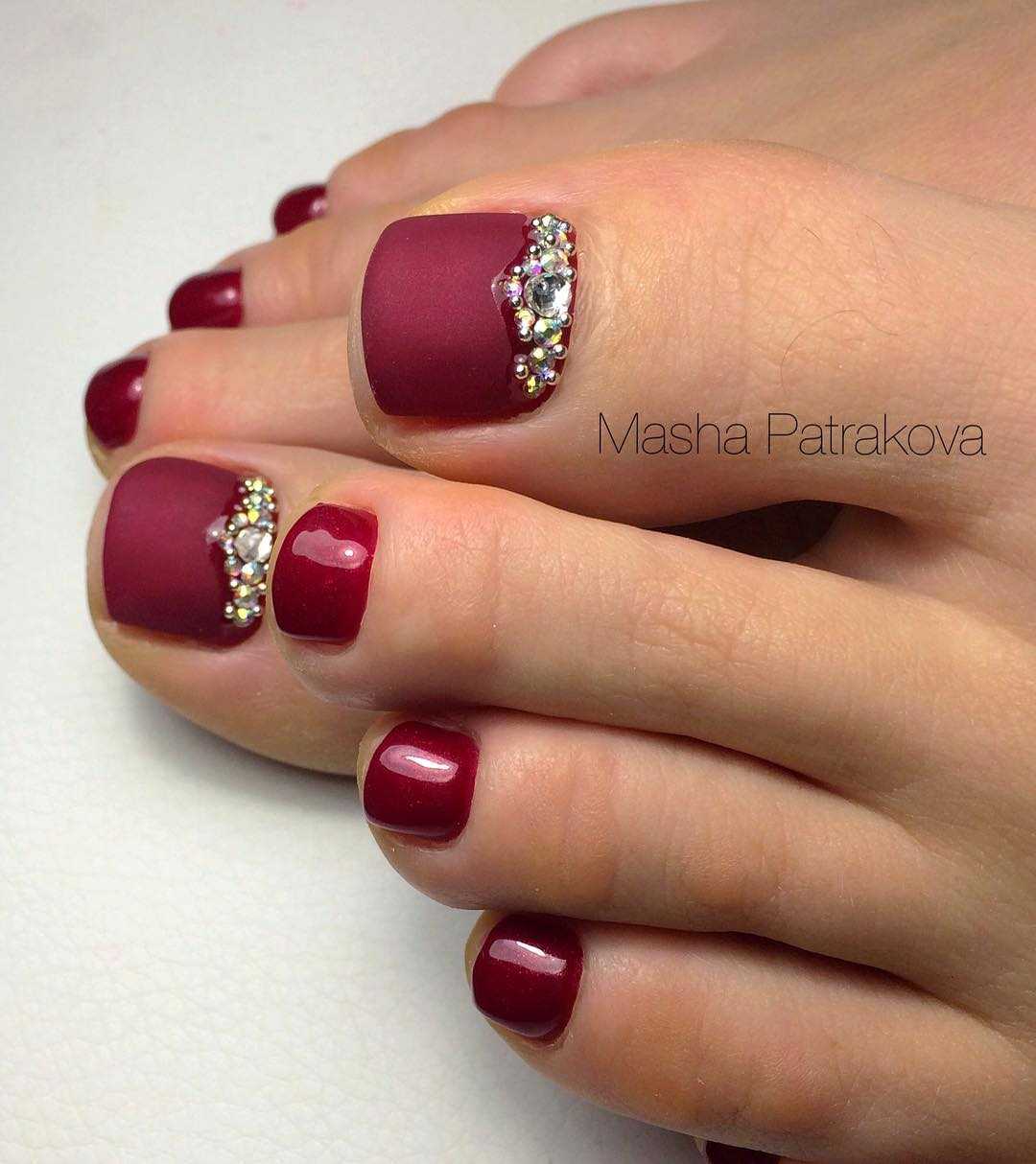 На ногах отлично смотрятся насыщенные и яркие оттенки. Один из них – бордовый. Именно этот красный цвет с темным подтоном будет смотреться на ваших ноготках благородно и стильно.