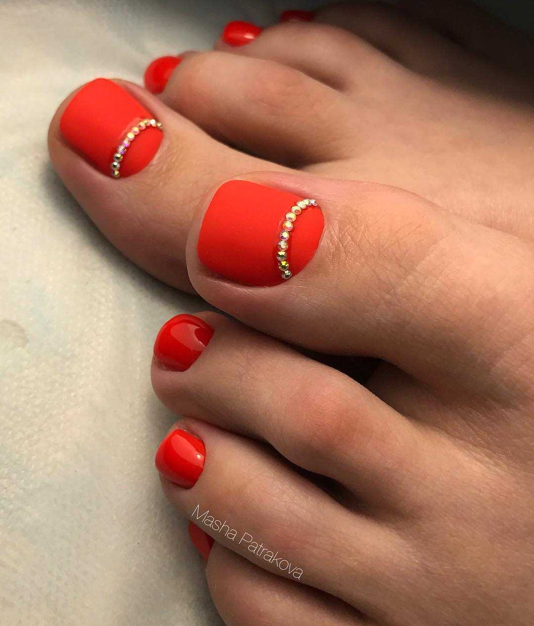 Если яркость красного цвета вас пугает, тогда попробуйте выполнить матовый красный педикюр. Он выглядит сдержанно и благородно. При этом не забудьте добавить в педикюр декор стразами, бульонками или серебряным, золотым глиттером. Однотонный матовый педикюр не приемлем, он смотрится банально и просто.