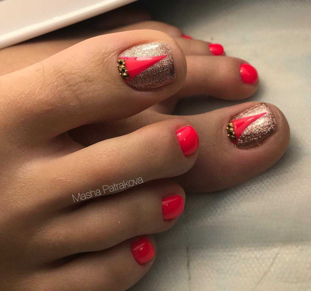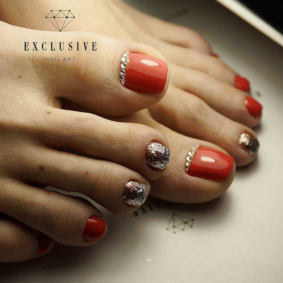 Конечно, педикюр с декором не уступает место минималистичным, классическим и однотонным идеям. Так, красивого эффекта можно добиться при помощи гель-лака с глиттером, втирки, фольги, конфетти, страз, использование приема «паутинка», наклеек. И даже матового топа.
