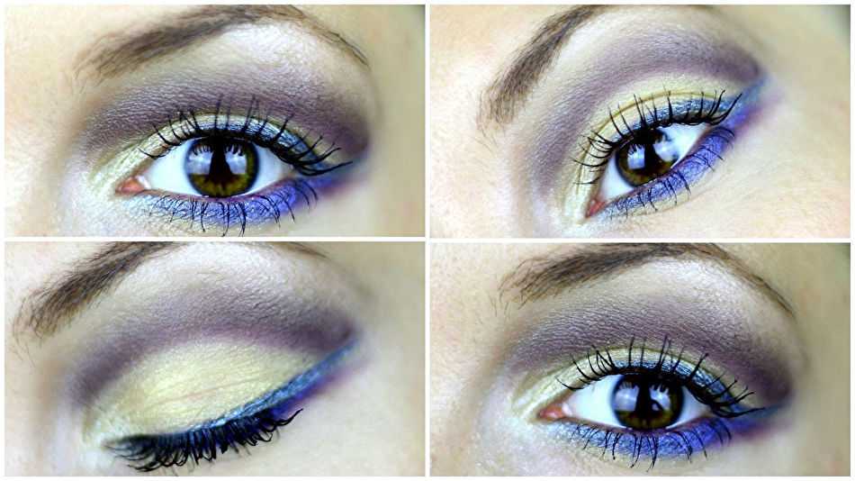 Роскошно выглядит макияж глаз с нависшим веком в синих и фиолетовых тонах. Теплый темный карий очень эффектно оттеняет холодная глубокая гамма. Существуют разные варианты нанесения, предлагаем остановиться на самом простом: