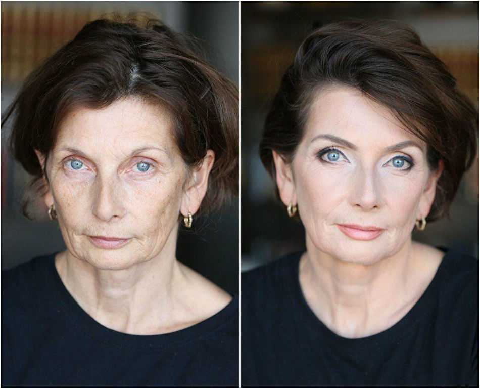 Настоящая леди выглядит безупречно в любом возрасте, а омолаживающий макияж для нависших век помогает всегда быть ухоженной и красивой. Оформленные брови, матовые розовато-бежевые тени, темно-серая растушеванная линия по внешнему уголку и подкрашенные ресницы — идеальный вариант для любого повода.