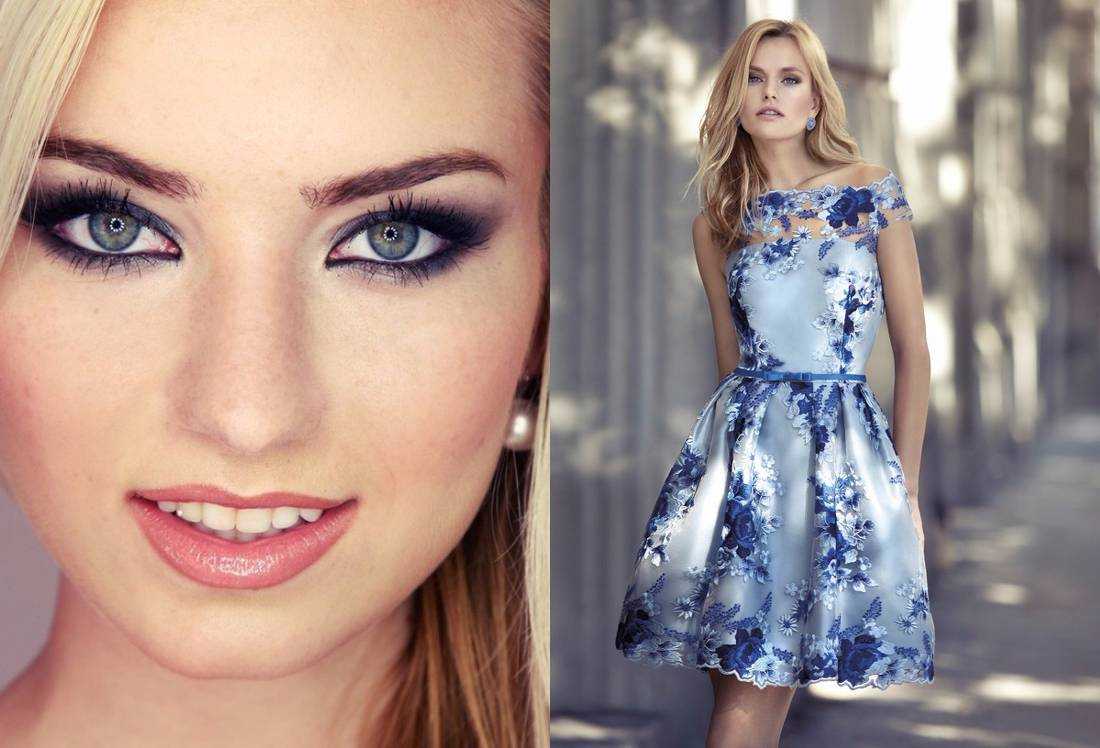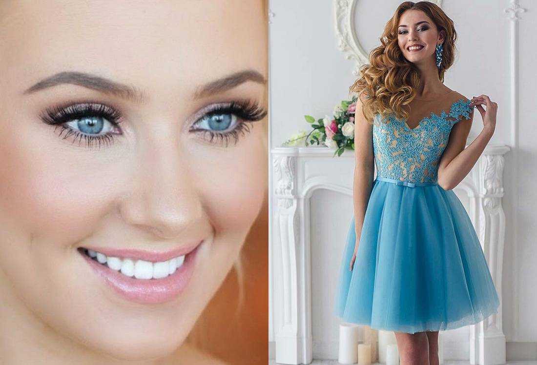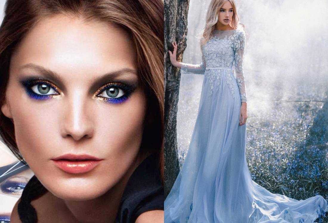 Голубые и сапфировые наряды идеально сочетаются с каштановыми, русыми и пепельными волосами, имидж получается загадочным, оттеняющим глубину взгляда. Основным акцентом является дымчатый макияж глаз, его матовость дополняет светлый тональный крем с бронзером. Густые ресницы подчеркнут открытость и свежесть. Серо-синие и фиалковые тени хороши в качестве вечернего варианта, днём уместнее светло-бежевый, кремовый, стальной. Если синее платье в тёплых тонах, темноглазым к лицу фисташковые тени в сочетании с морковной помадой. Уникальные сочетания дополнят румяна медных оттенков.