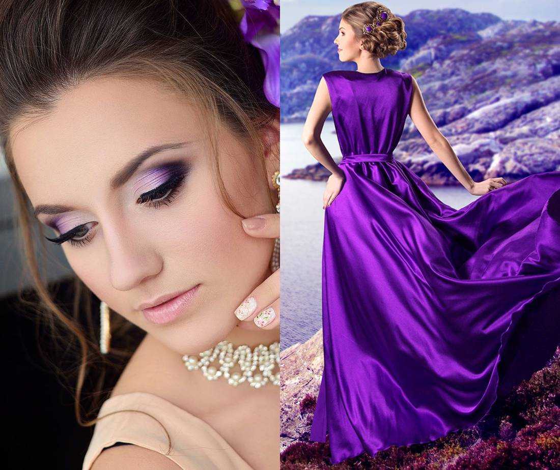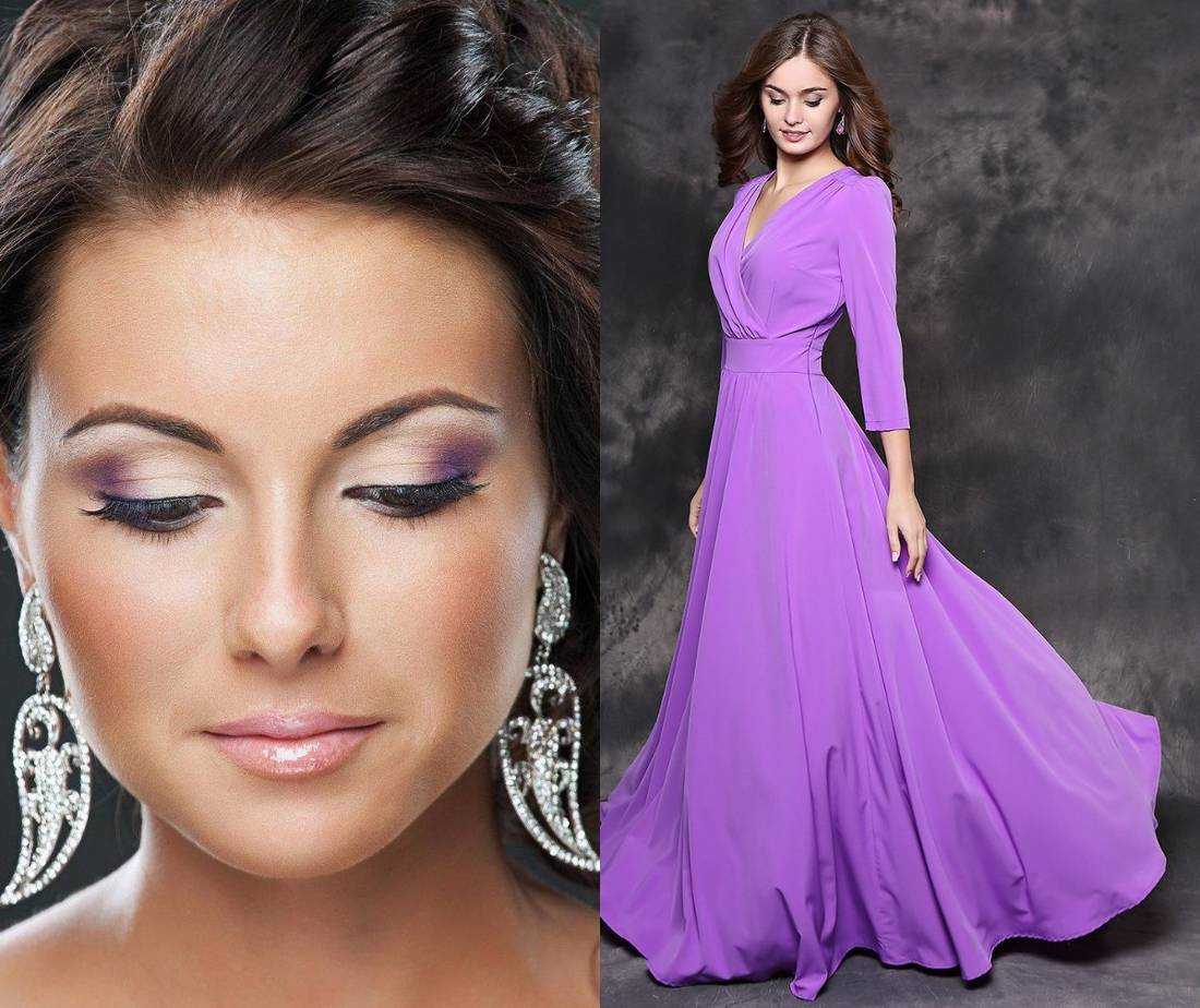 Оба типажа украсят сияющие и перламутровые текстуры, тени фиолетовых и синеватых оттенков, но не копирующих цвет платья.