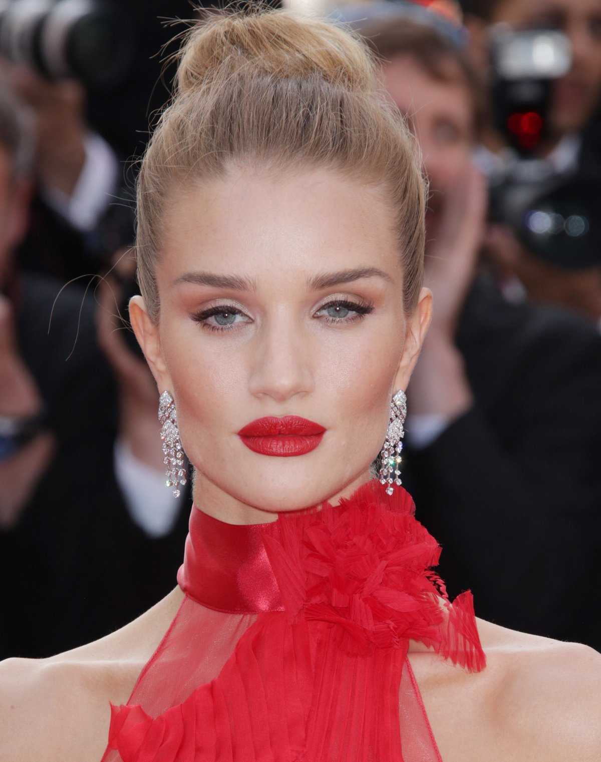 Красная помада способна создать яркий акцент, дополнив вечерний образ, но оттенок ее выбирать нужно осторожно — она должна быть близка оттенку платья и сочетаться с цветом волос и глаз. Также следует учесть, что насыщенные цвета визуально увеличивают рот, поэтому обладательницам пухлых губ и широкого рта выбор лучше делать в сторону нудового оттенка, а не красного