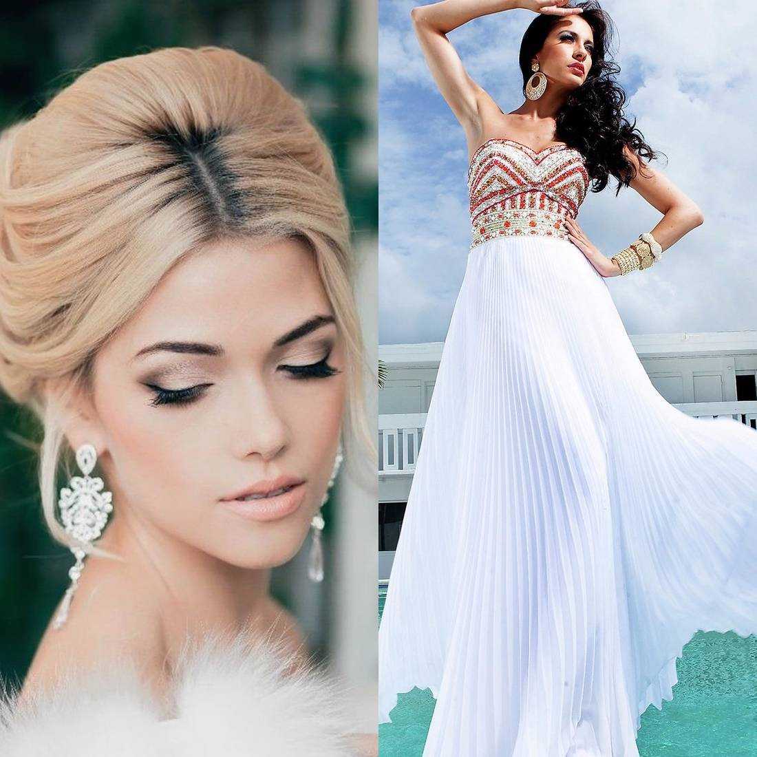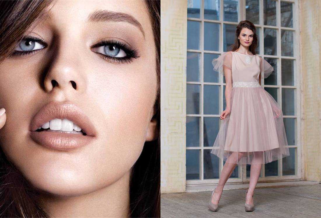 Акцентировать внимание на прическе и платье позволит макияж nude. Чтобы make up не сливался с нарядом, добавьте ему блеска