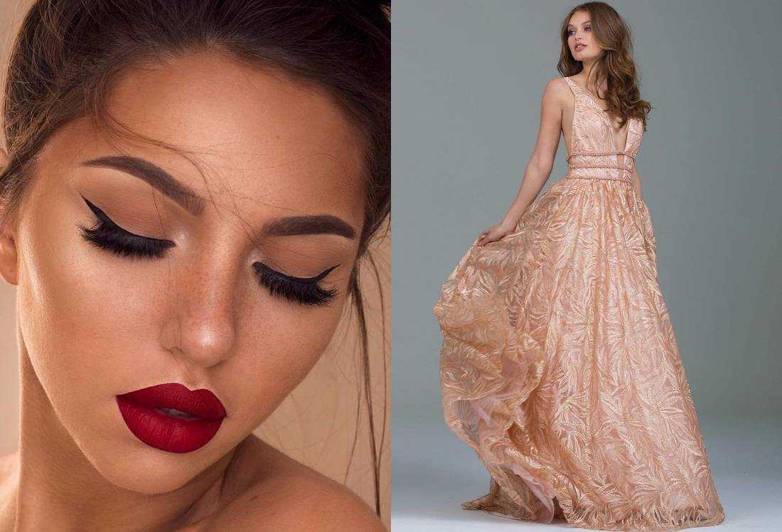 - Подобрать губную помаду, соответствующую оттенку платья.