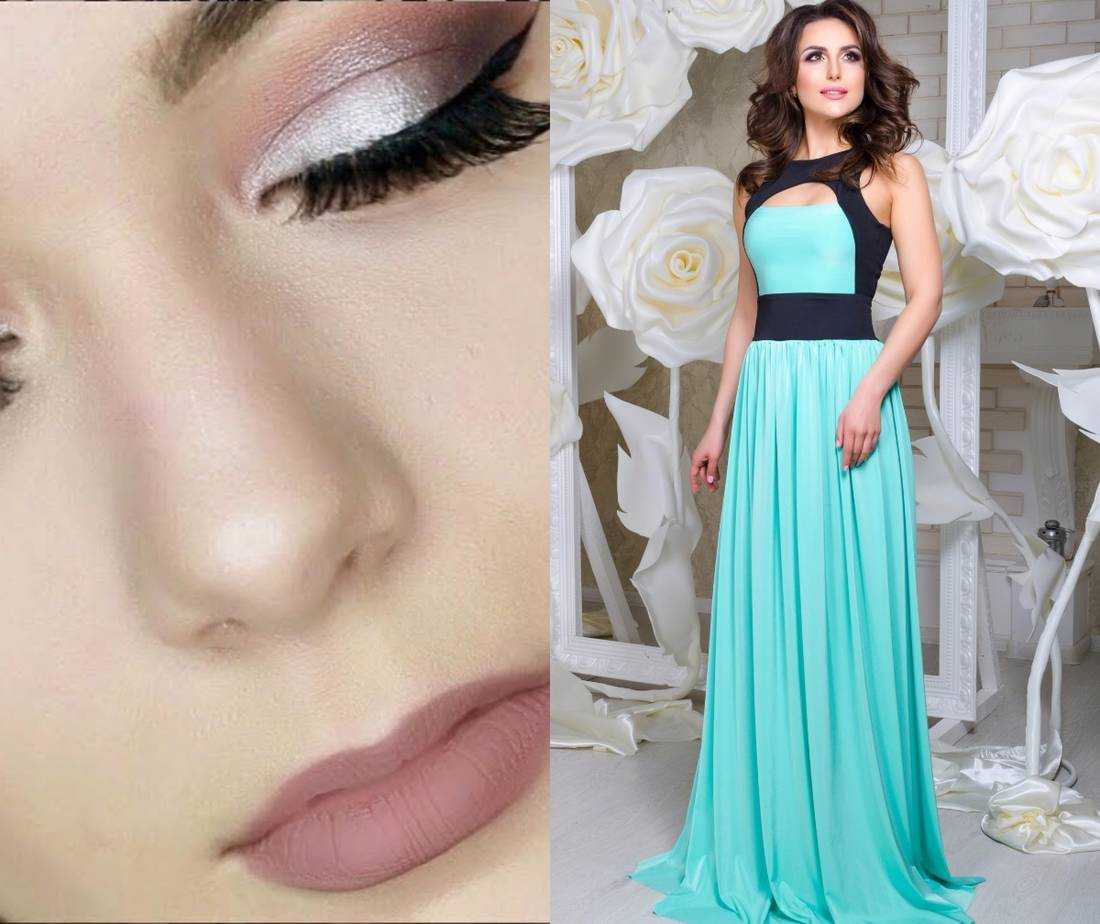 Холодный оттенок наряда подходит всем. Правильным макияжем стоит создать романтичный или неприступный образ. Тени стоит выбрать серебристых оттенков, а выразительность глаз подчеркнуть черными стрелками. Тушь выбирайте исключительно черного цвета.