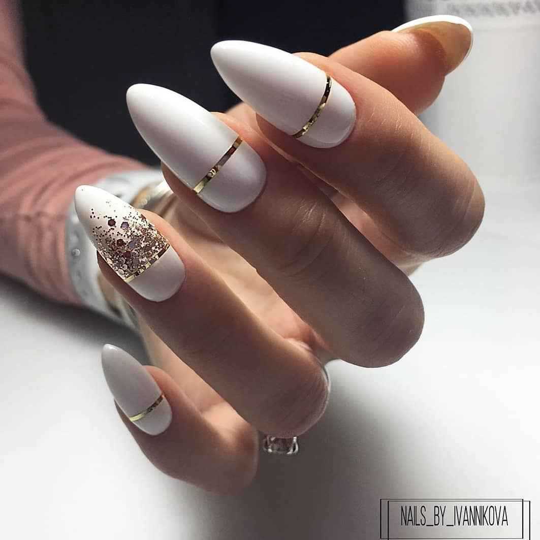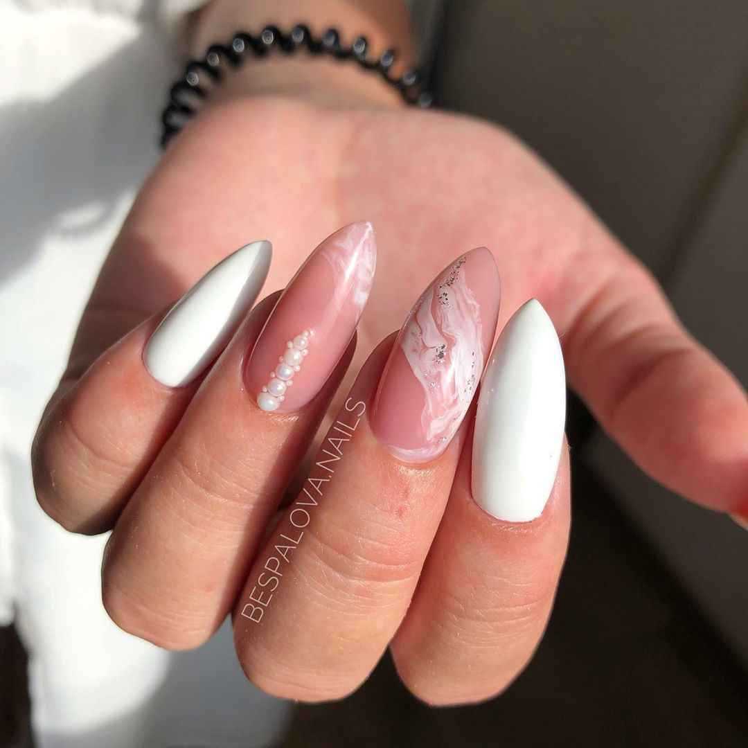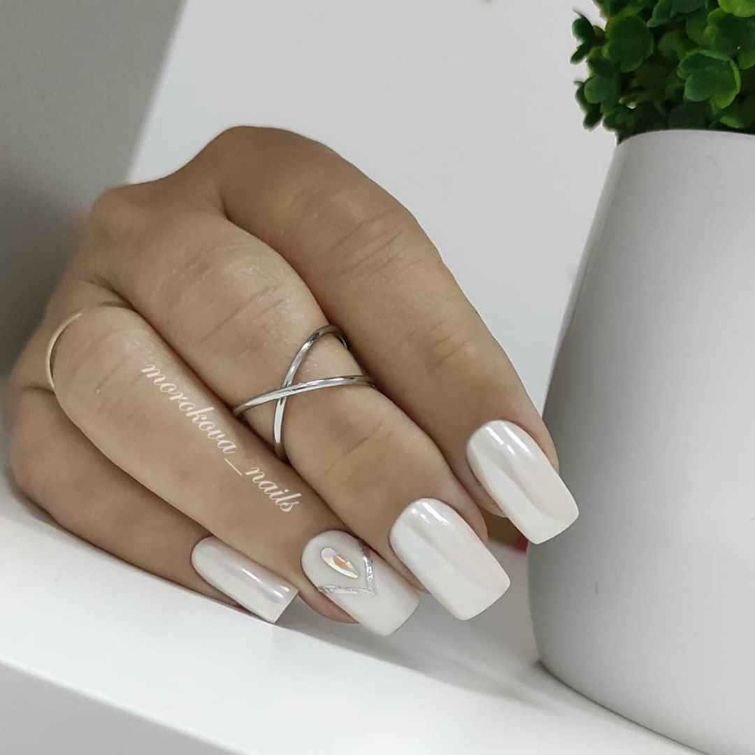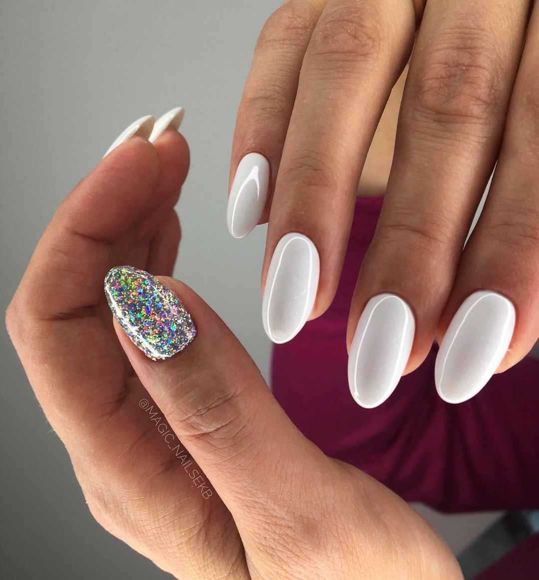 А универсальность цвета помогает сочетаться с любым образом. Дополняют белый маникюр чаще всего стразами, жемчужинами, глиттером или фольгой.