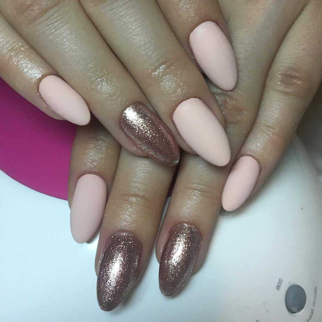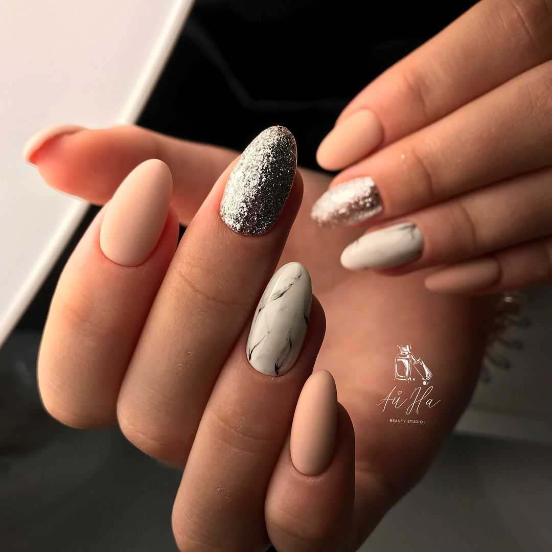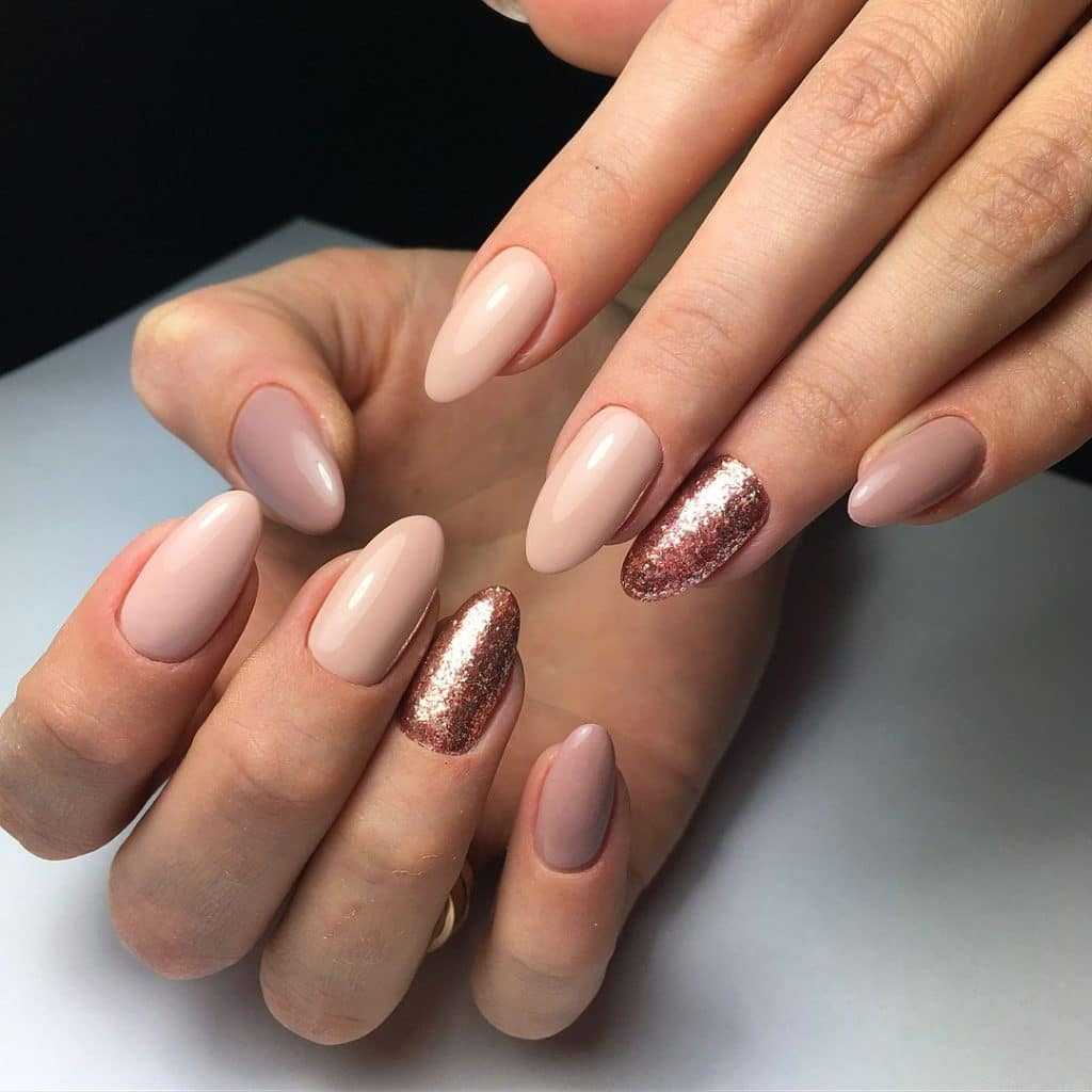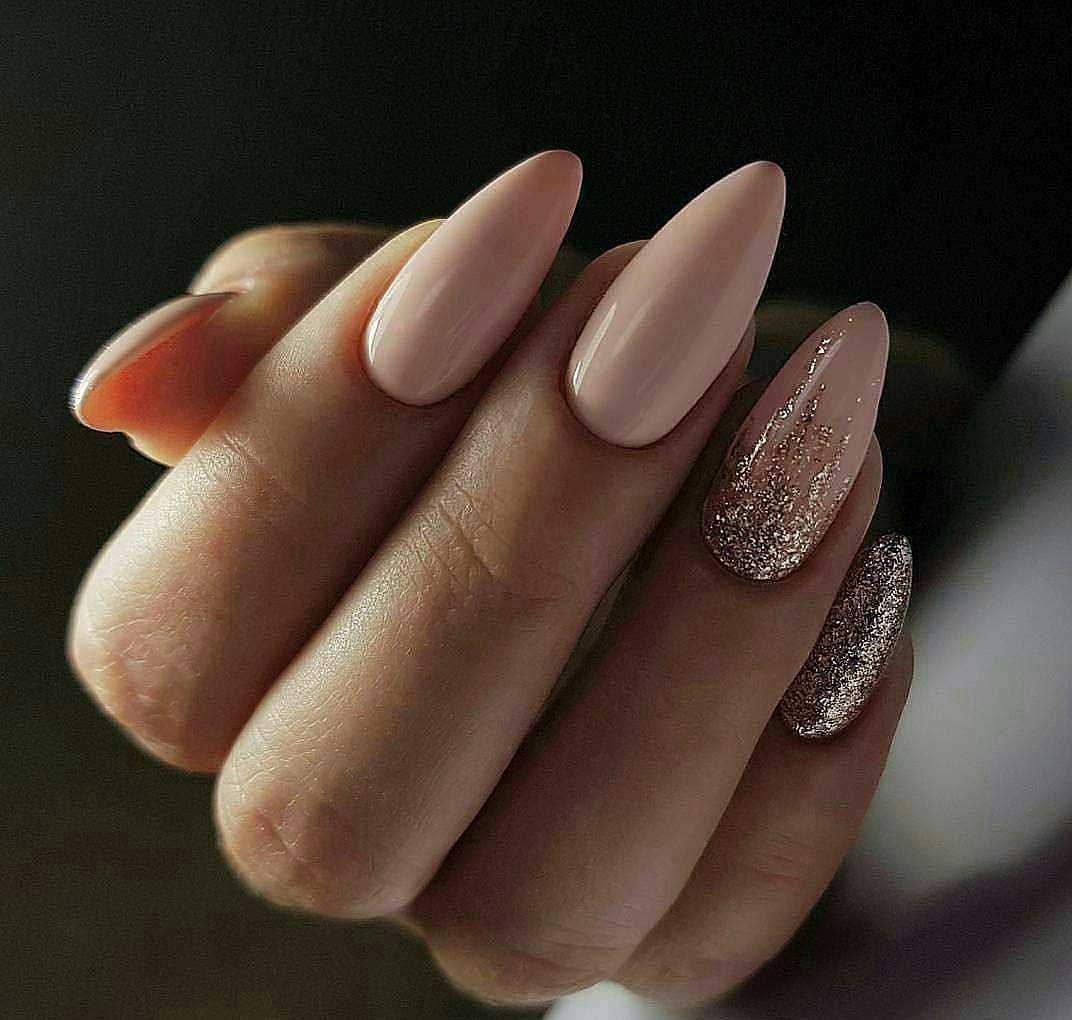 Достаточная длина ногтевых пластин позволяет воплотить в реальность множества идей, а нюдовая палитра смягчает любую форму. Чтобы не утяжелить маникюр, блёстки следует располагать на ногтях аккуратно. Как пример, можете нанести на ноготки выбранный нюдовый оттенок и украсить один из них полностью блестящими частицами либо оформить у основания несложный узор. Также очень впечатляют на длинных ногтях разнообразные рисунки, которые в нашем случае могут выполняться блестящими лаками или прорисовываться глиттером.