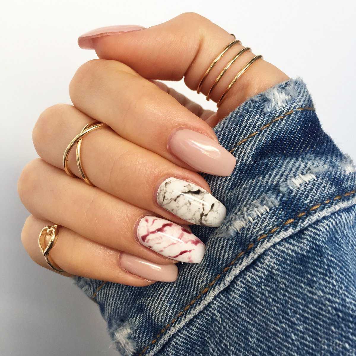 - дополните дизайн мраморным узором – этот очередной модный тренд сезона полюбился многим модницам. Кроме того мраморный маникюр великолепно выглядит в сочетании с белым и бежевым цветом.
