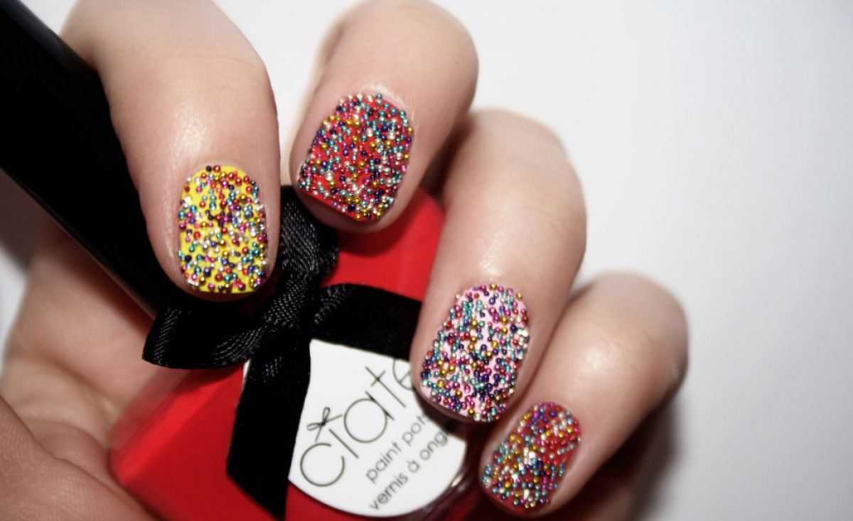 При полном покрытии всех ногтей бульонками получается икорный маникюр. Россыпь маленьких шариков выглядит поистине роскошно. Делается он проще, чем кажется. При создании маникюра с узорами из бульонок нужно скрупулезно выстраивать определенную последовательность шариков. А при икорном маникюре ногти с еще не высохшим лаком просто опускают в емкость с бульонками. Остается только закрепить результат и вуа-ля! – шикарный маникюр готов.