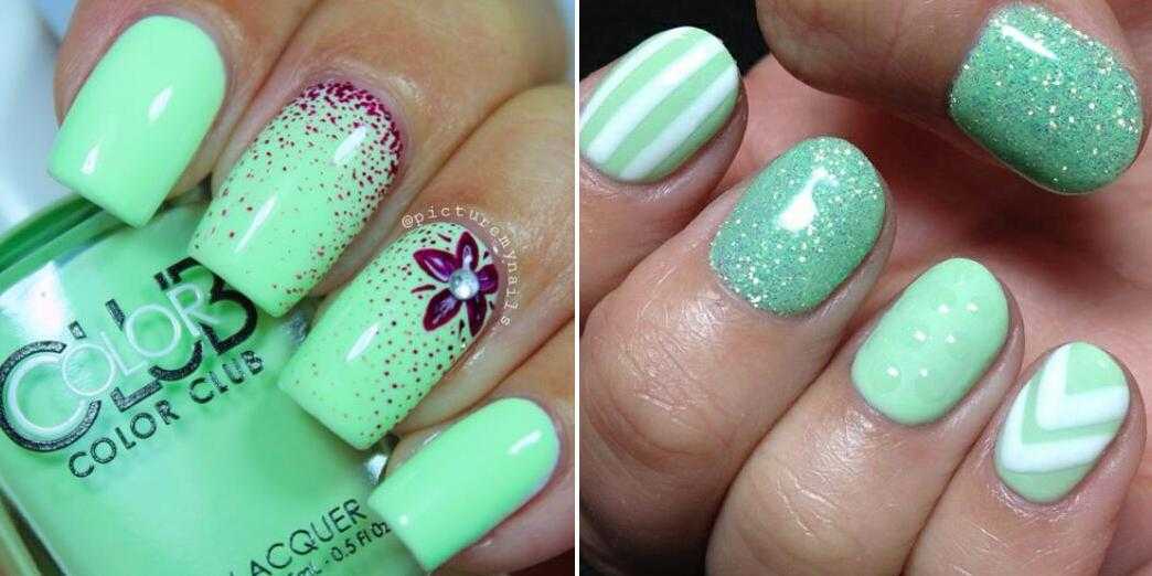 В нейл-арте могут использоваться любые тона мятного (от бирюзового до цвета морской волны), но актуальней всего подбирать теплые оттенки этого цвета.