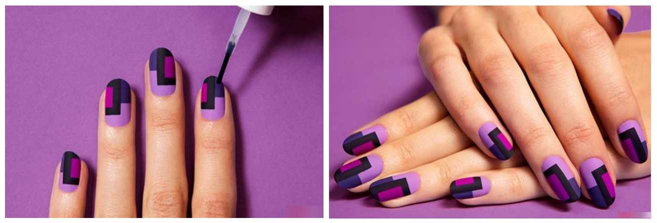 - Отлично смотрятся геометрические дизайны на длинных матовых ноготках.