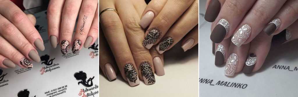 Изящно смотрятся на темном матовом покрытии кружева, выполненные лаком при помощи трафарета.