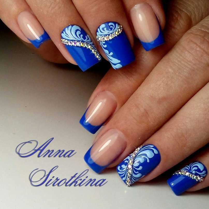 Яркие оттенки страз будут безупречно смотреться на темном покрытии, которое импонирует по своей цветовой гамме. Например, фиолетовые, синие камни отлично сочетаются с темным лаком.