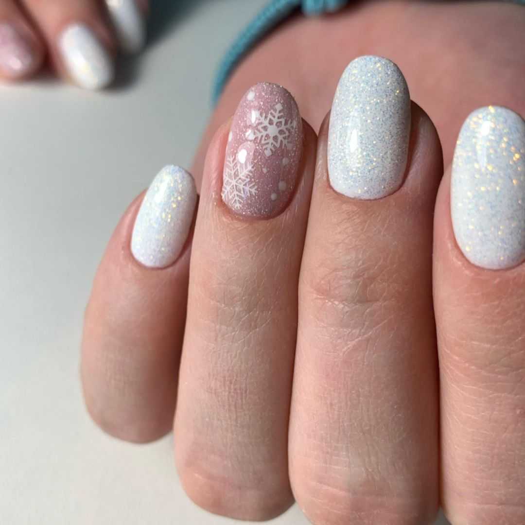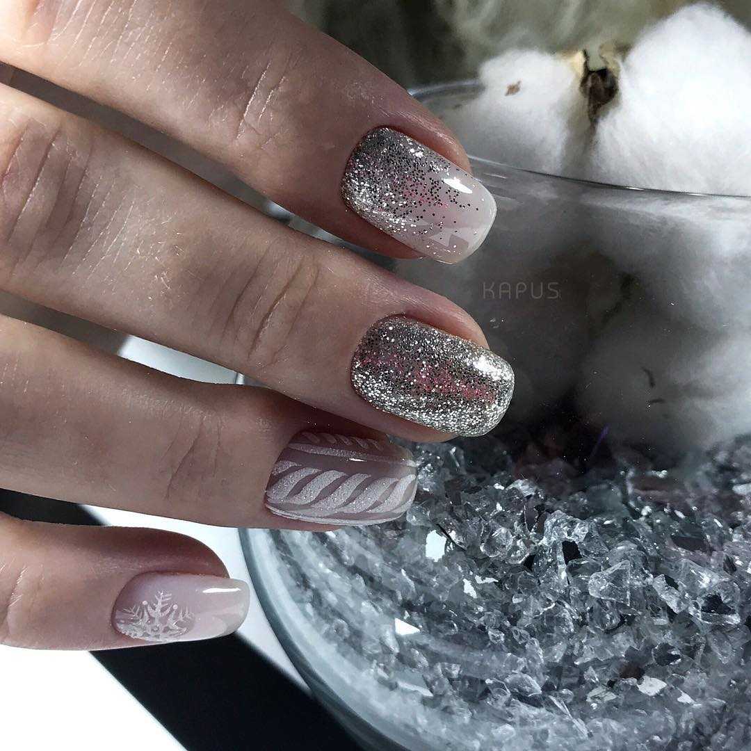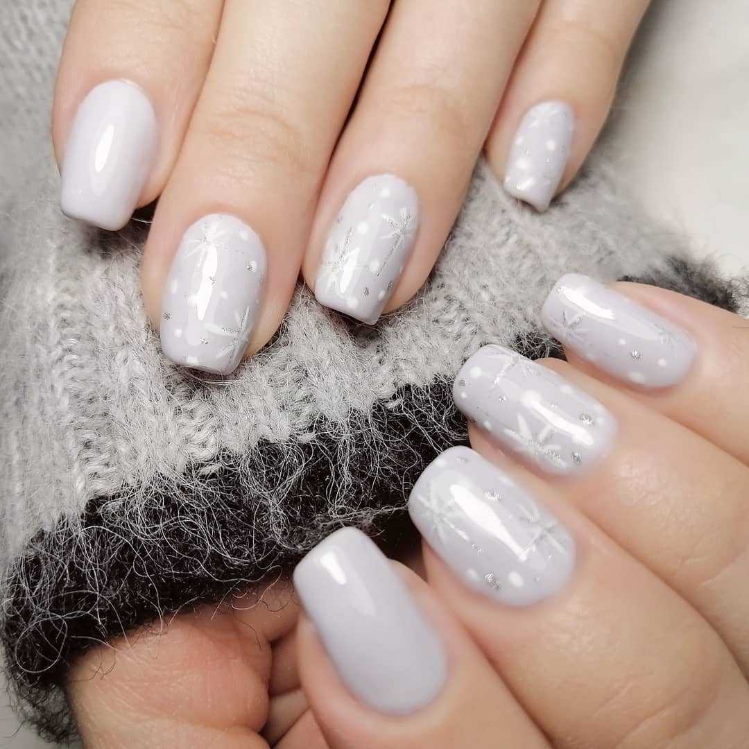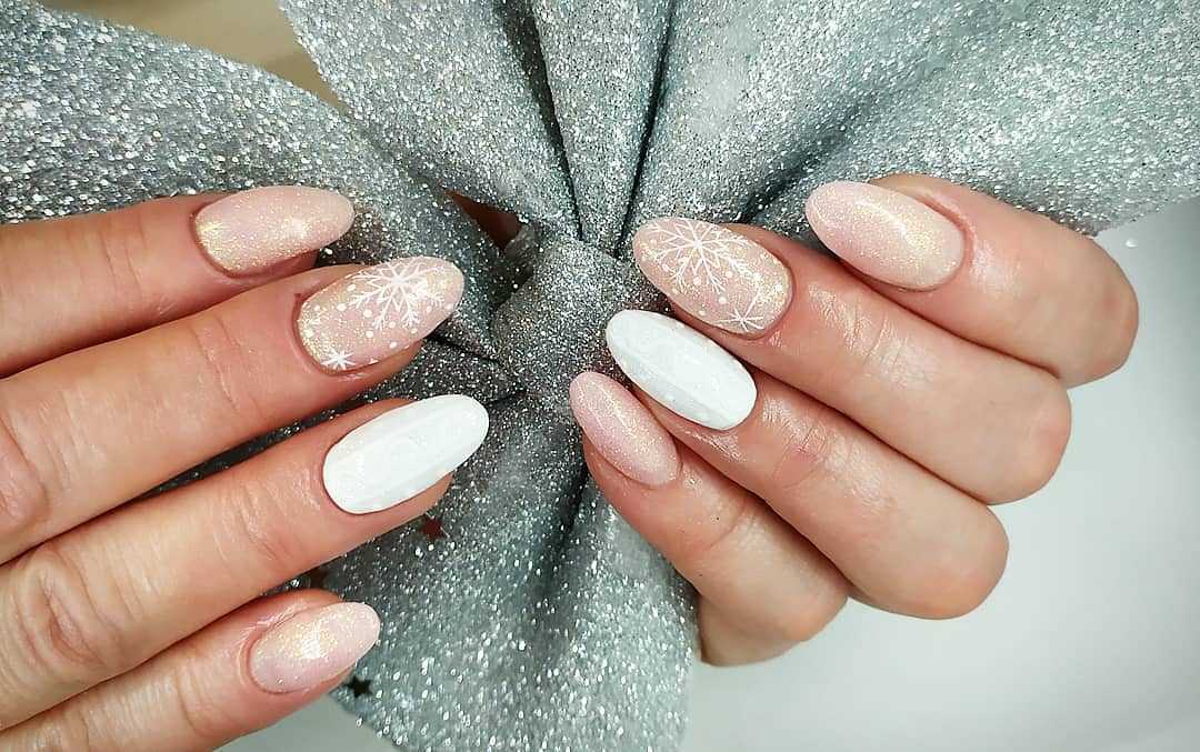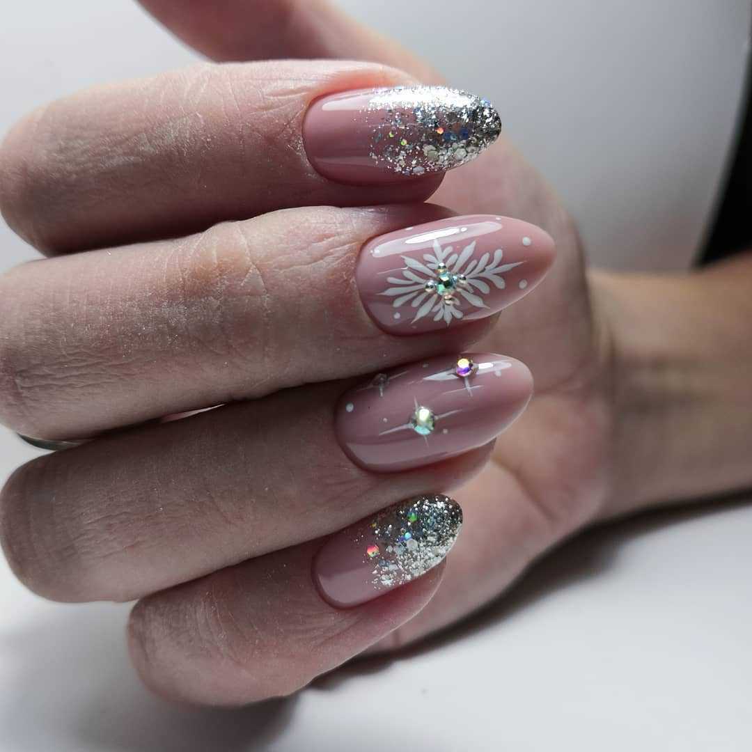Ниже представлена очень интересная идея — нюдовый маникюр со снежинками. Едва заметные рисунки как нельзя лучше отражают зимнюю тематику, при этом не выглядят слишком навязчиво. Ну чем не идея для нового года? Модно, сдержанно и со вкусом.