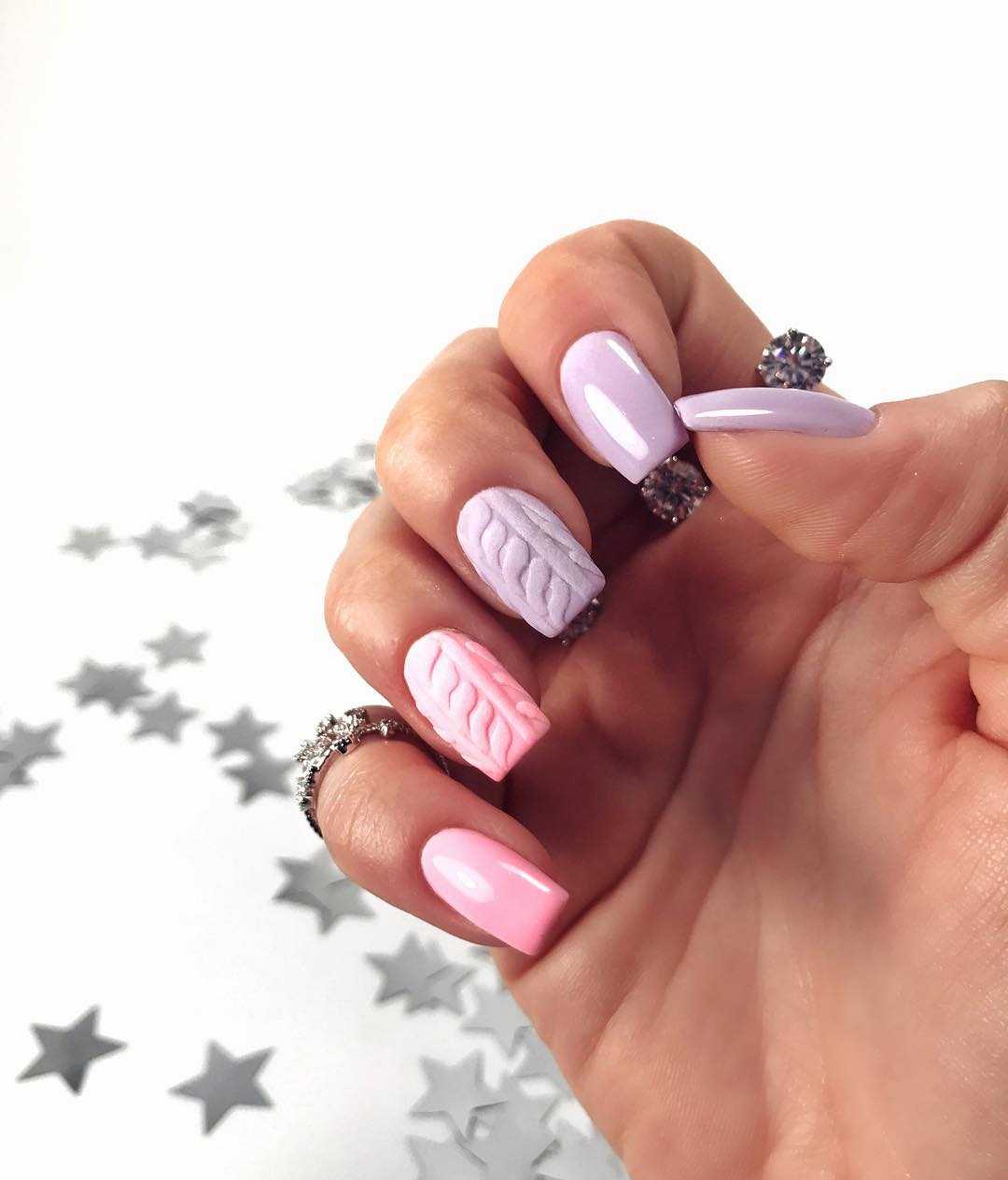 - свитер. Используя плотный гель лак в тандеме с акриловой пудрой можно разрисовать пластину, имитируя узоры на вязанном свитере. Такой модный дизайн точно не оставит никого равнодушным;